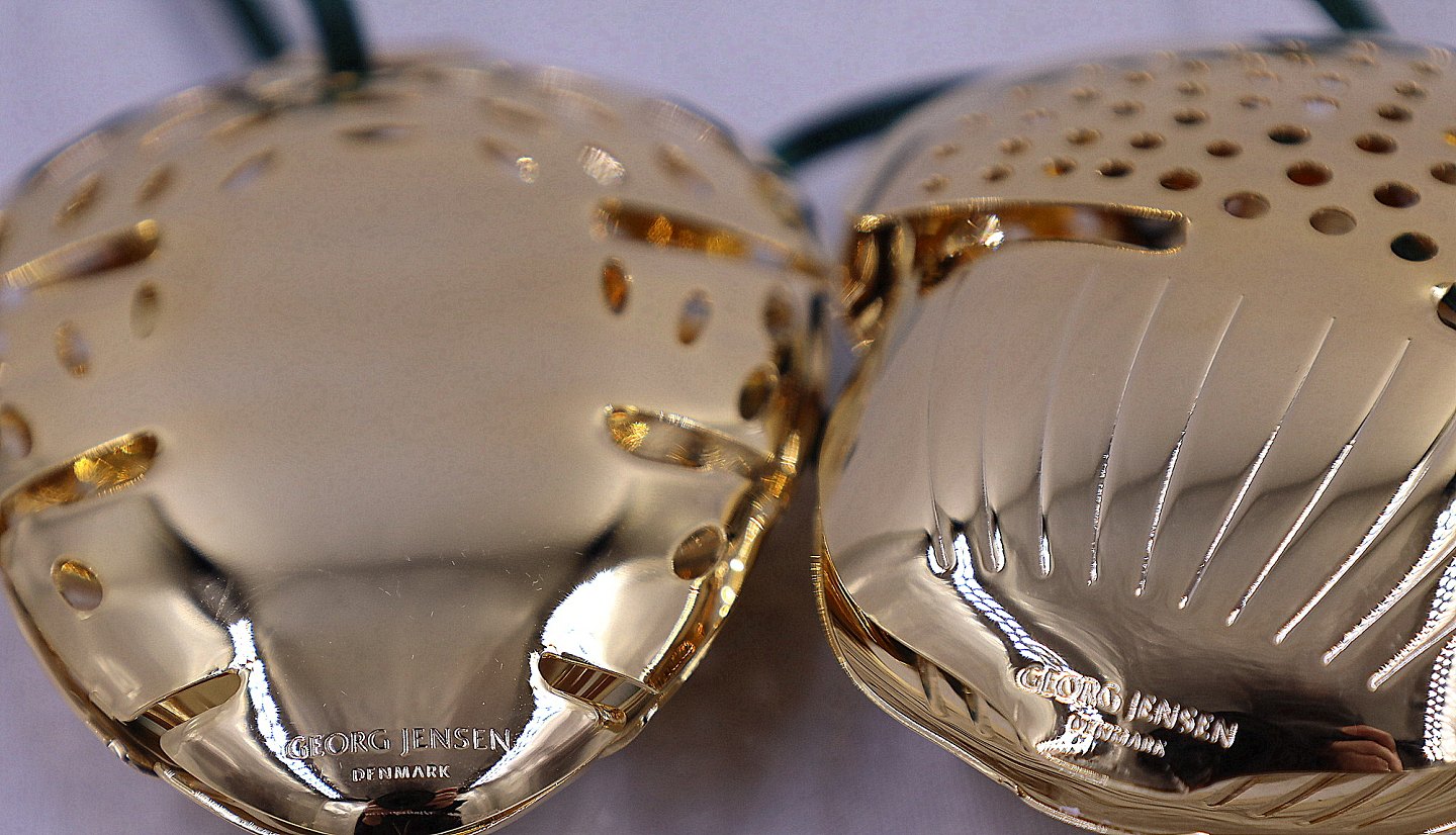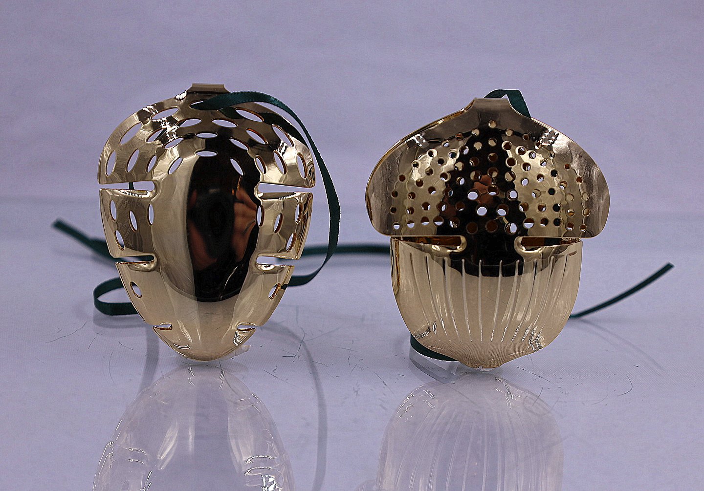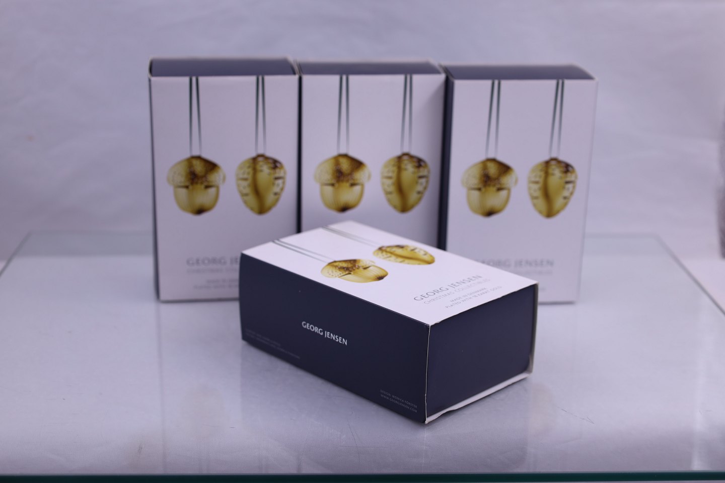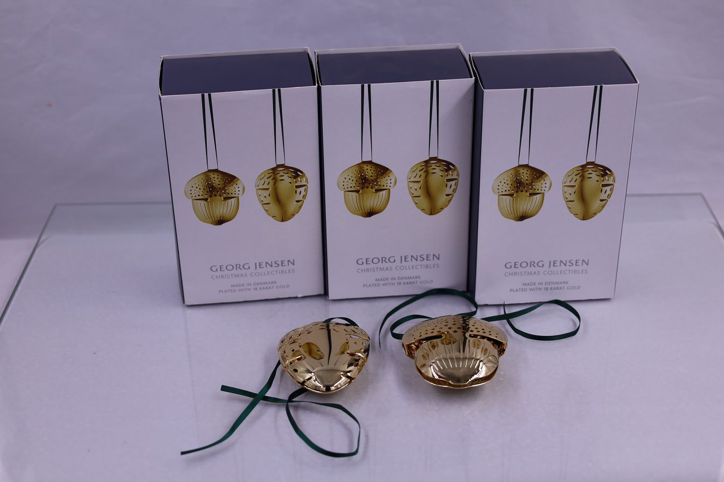 Georg Jensen, Julepynt, agern + kogle 2018. Juleornamanterne er fra Christmas Collctibles fra 2018. Ornamenterne er af messing og belagt med 18 karat guld. Alle juleornamenterne kommer i original æske og med rødt og grønt bånd til