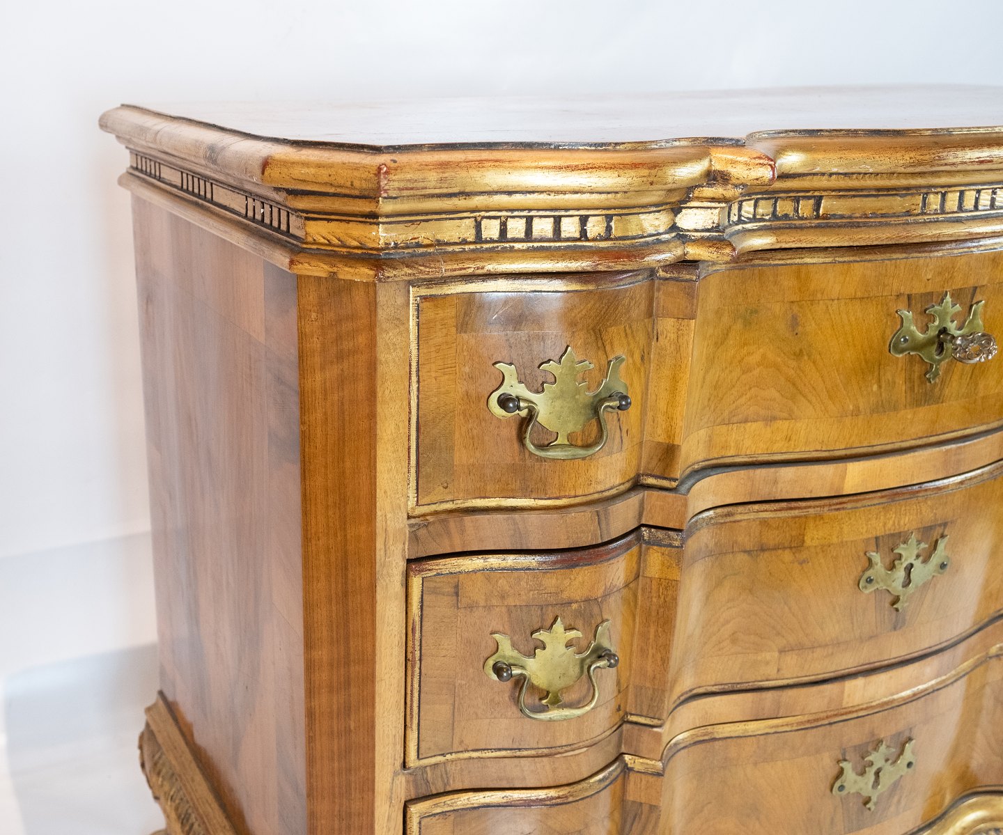 Kommode af poleret valnøddetræ dekoreret med forgyldning og håndtag af messing fra 1860erne. Møblet er i flot brugt stand.