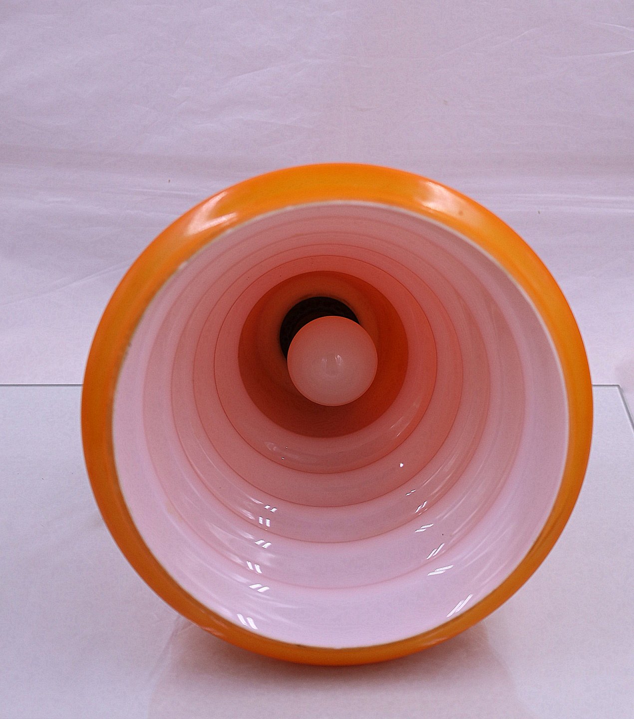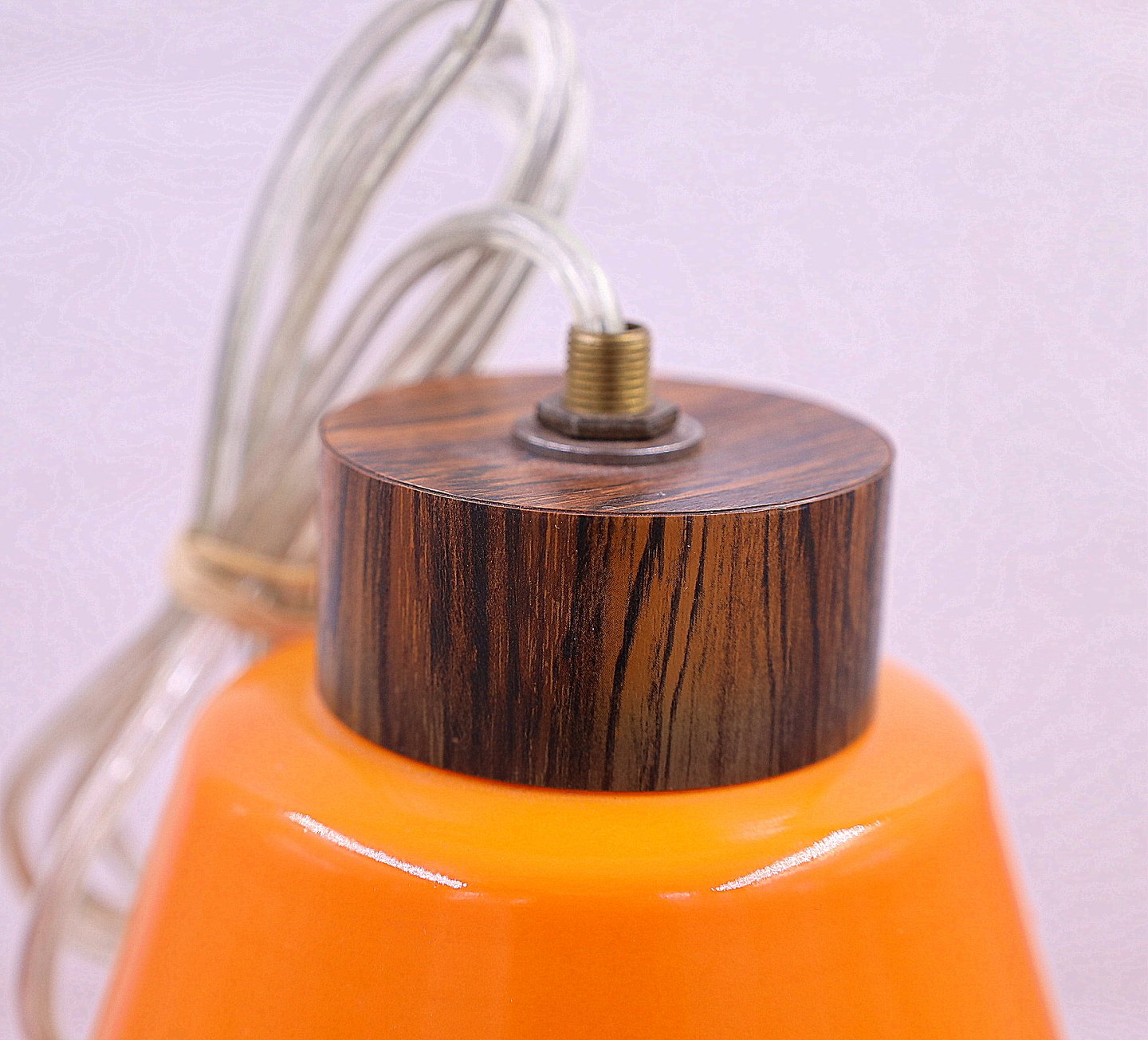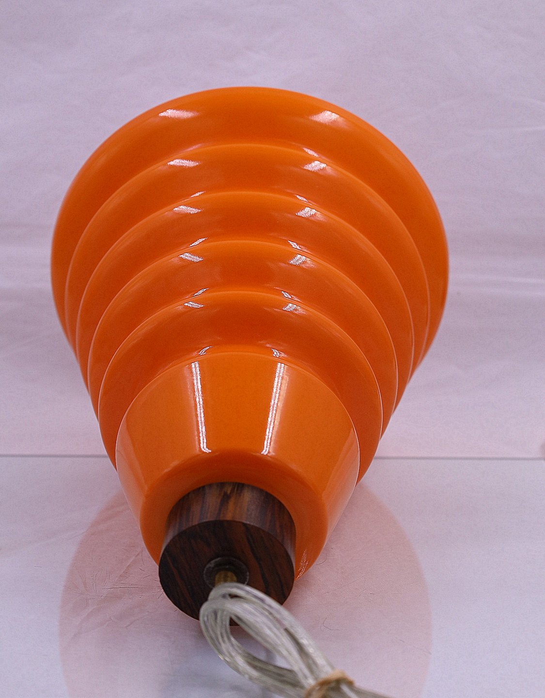 Orange loftslampe af glas. Lampen er i etager og konkav. Lampenskærmen har hvidt glas indvendig og en top af teaktræ samt klar plast ledning.