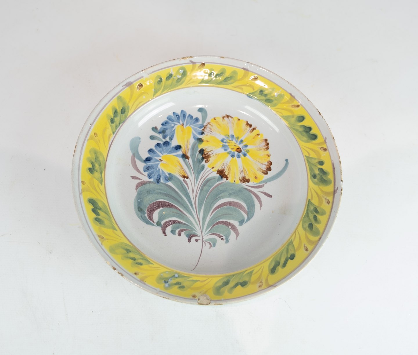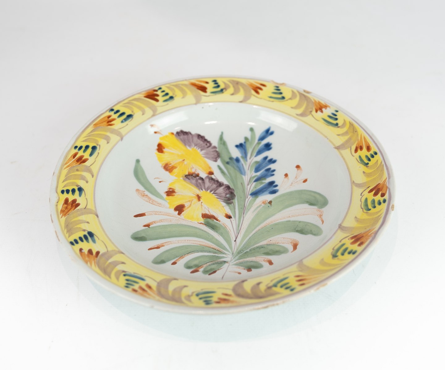Two Kelling Husen plates decorated in yellow colours and with different motives of German fajance from 1780s.