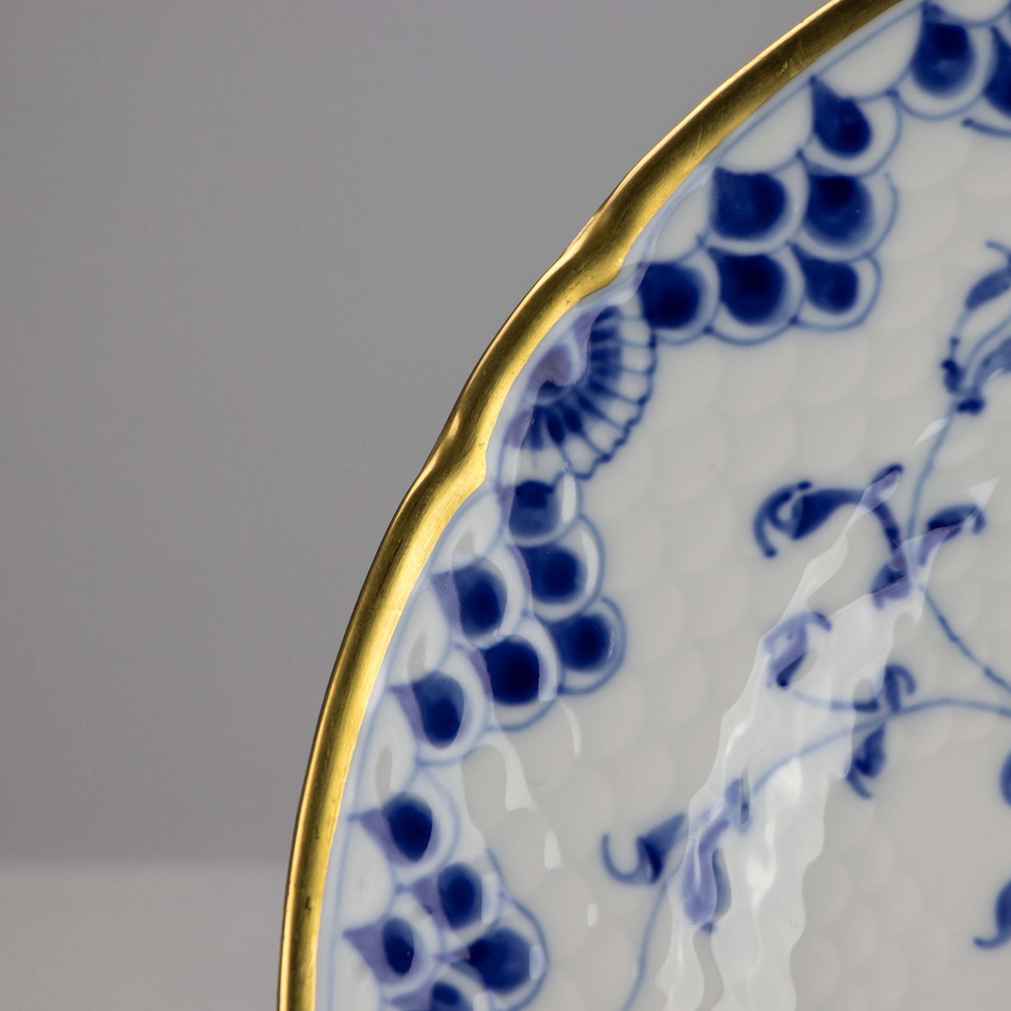 Tallerken i hvidt porcelæn med guldkant med blå motiver af blomster og sommerfugle.