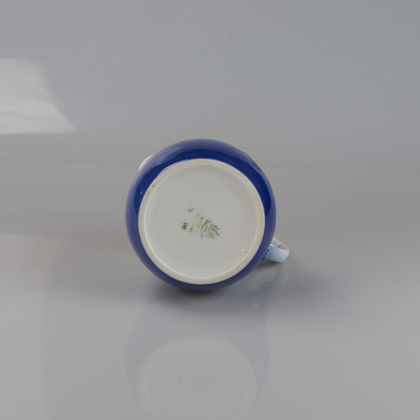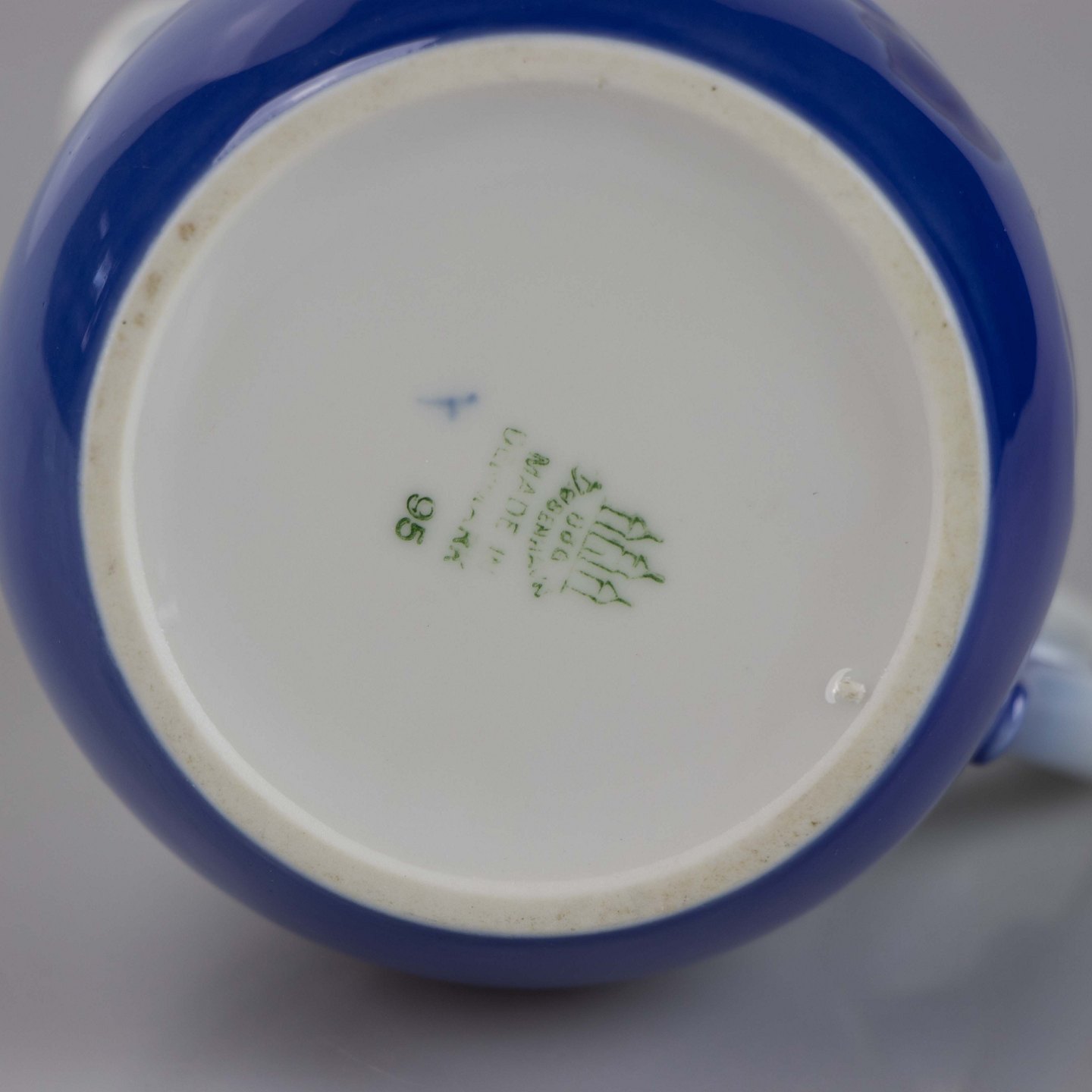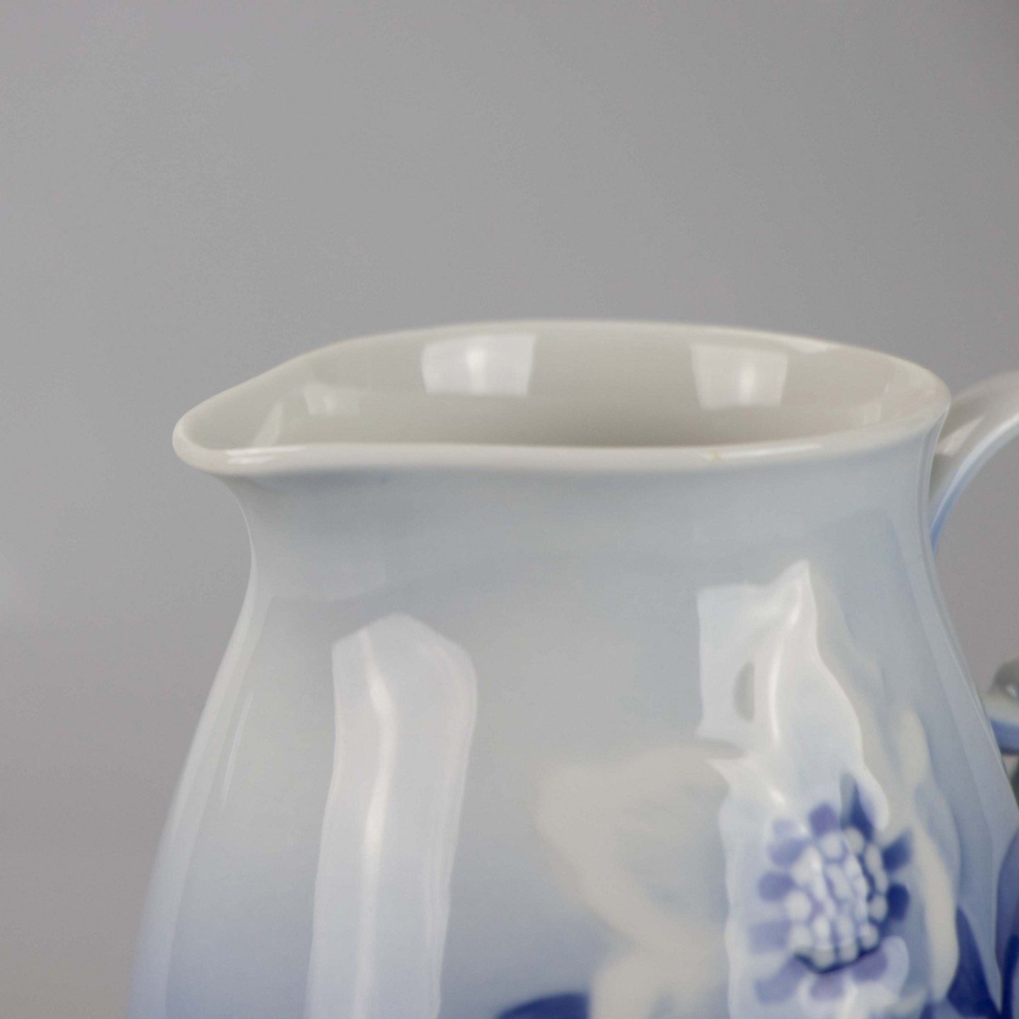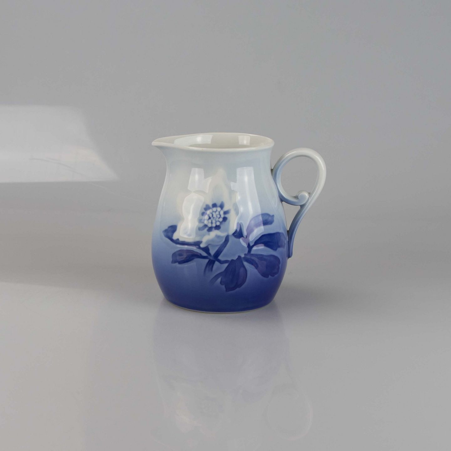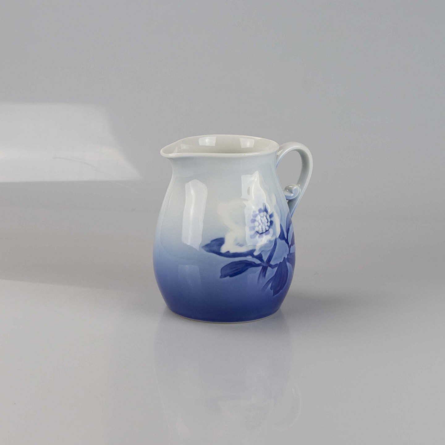 Kande i hvidt og gradueret blå porcelæn med motiv af julerose.