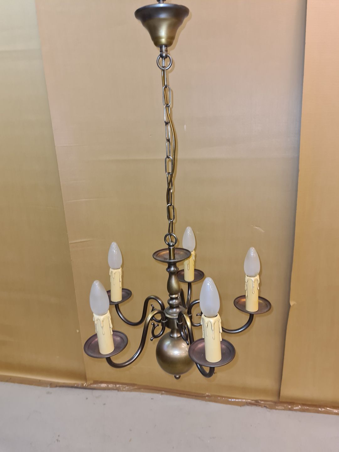 Nyere 5 armet kirkekrone. Fremstår fin og funktionsdygtig.