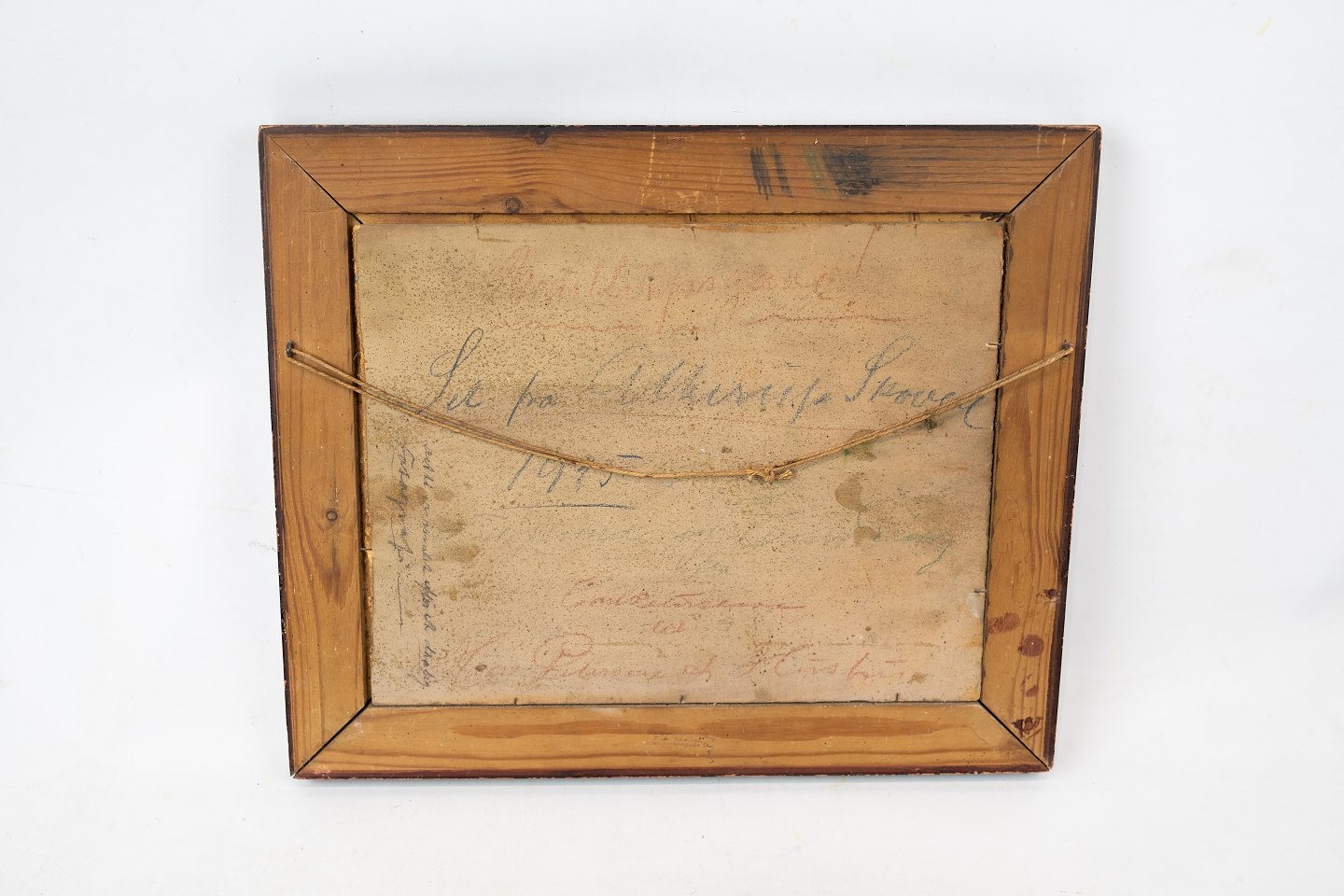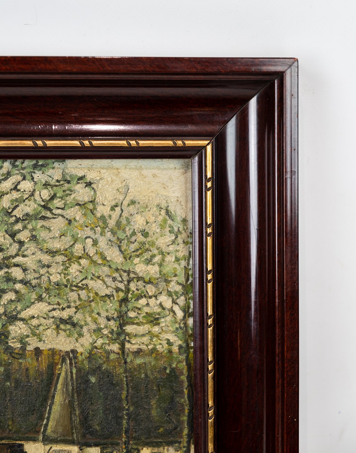 Oliemaleri med gårdmotiv og mørk træramme, fra 1915.