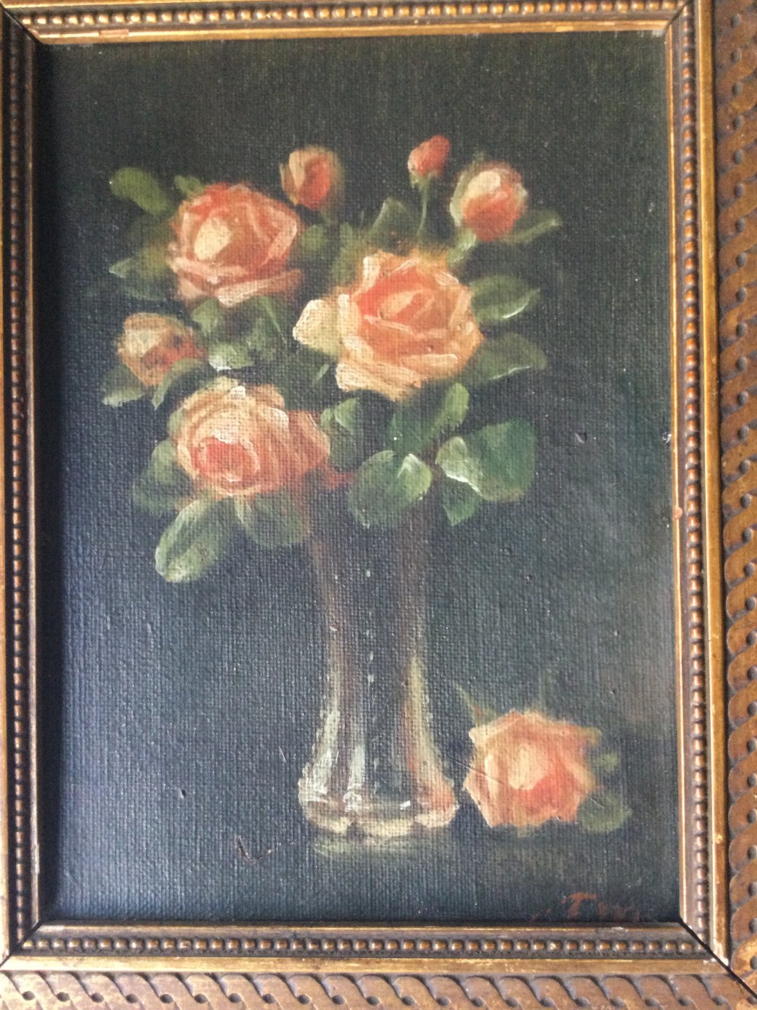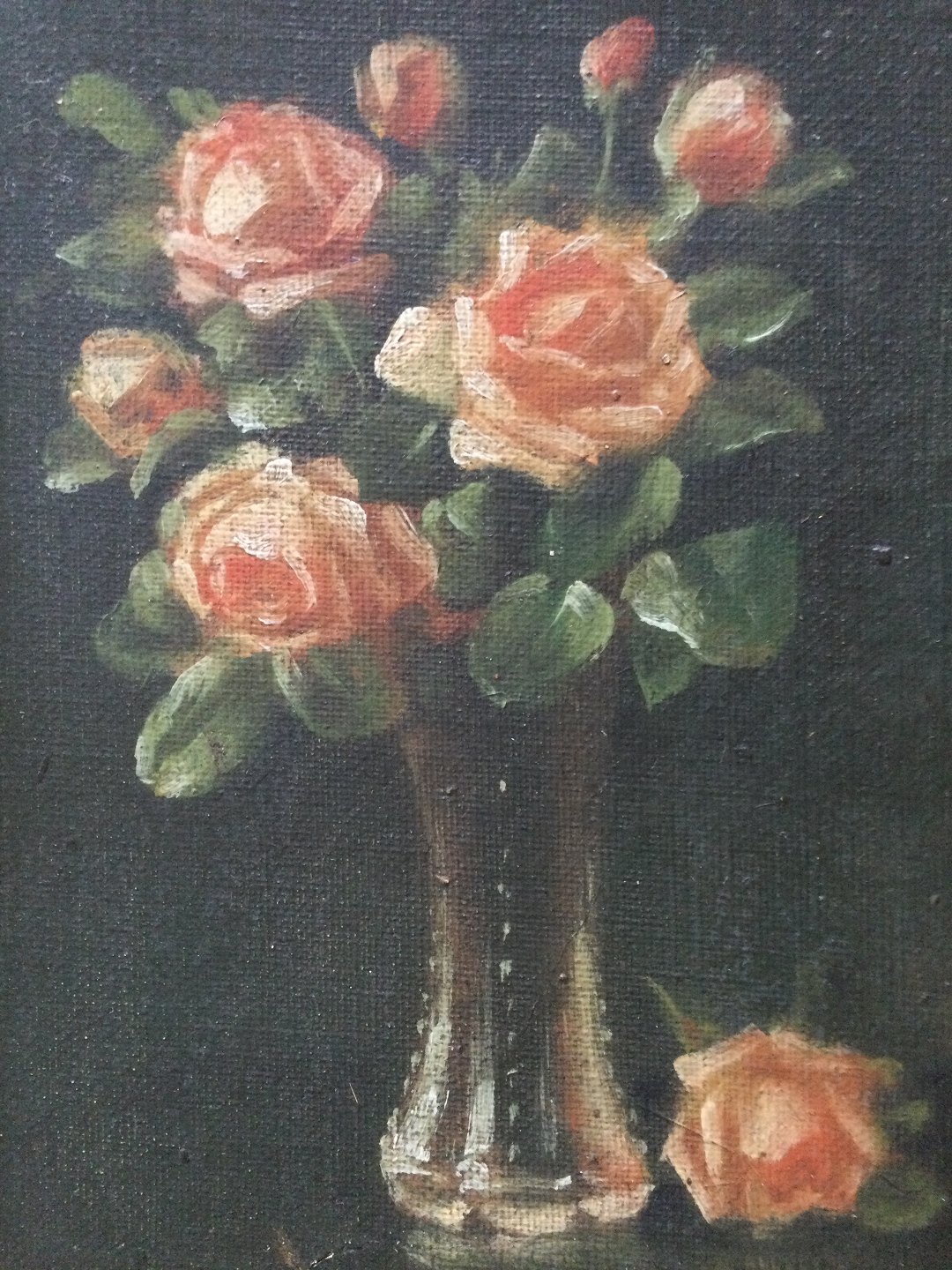 Maleri af C.F. Madsen - Lyserøde roser i glasvase.