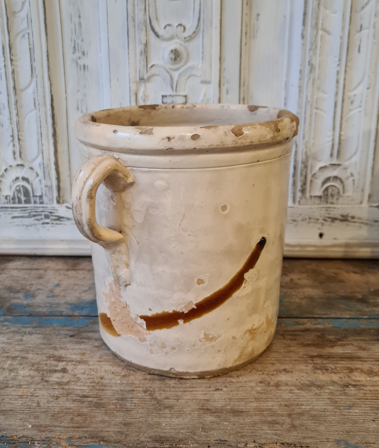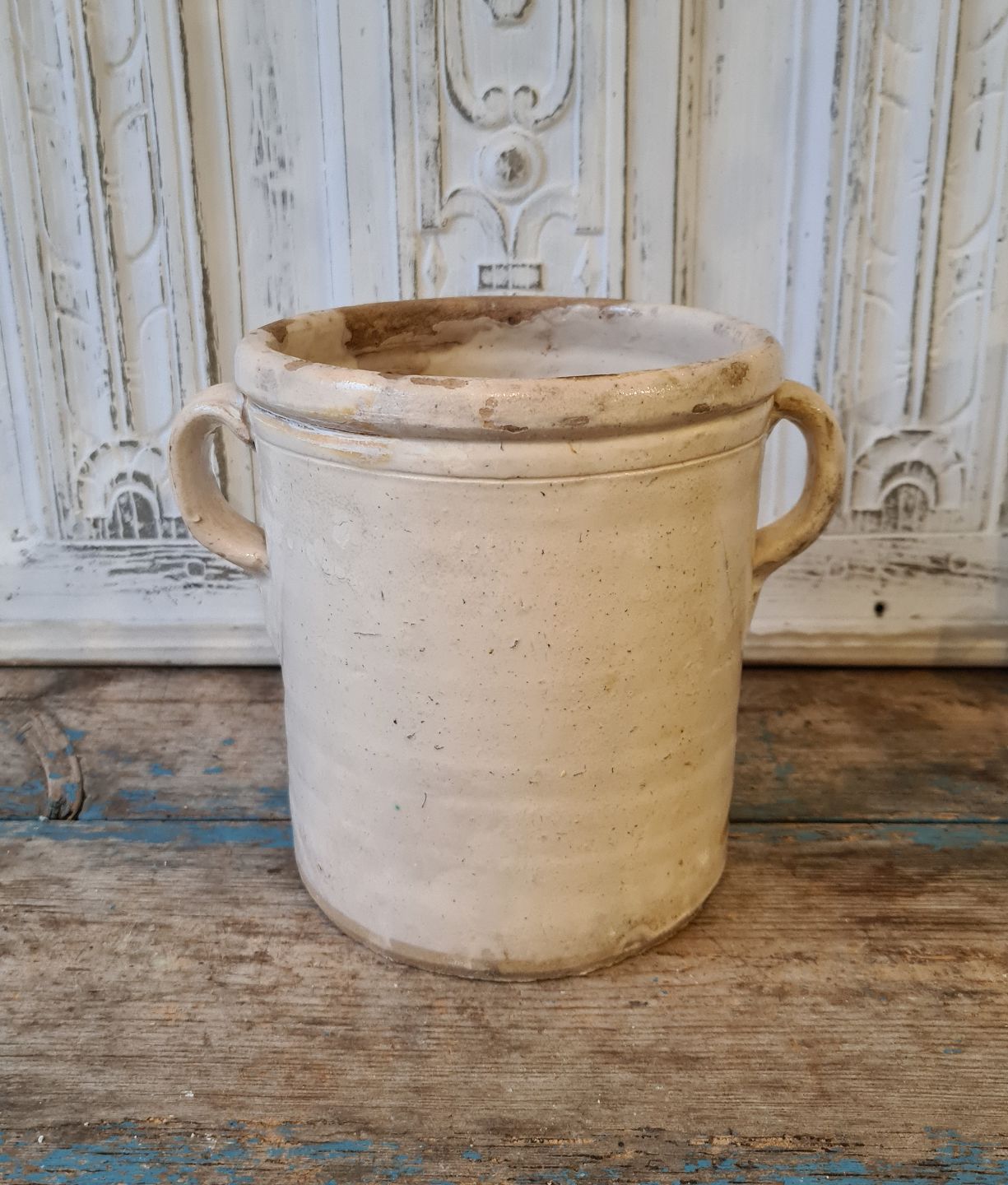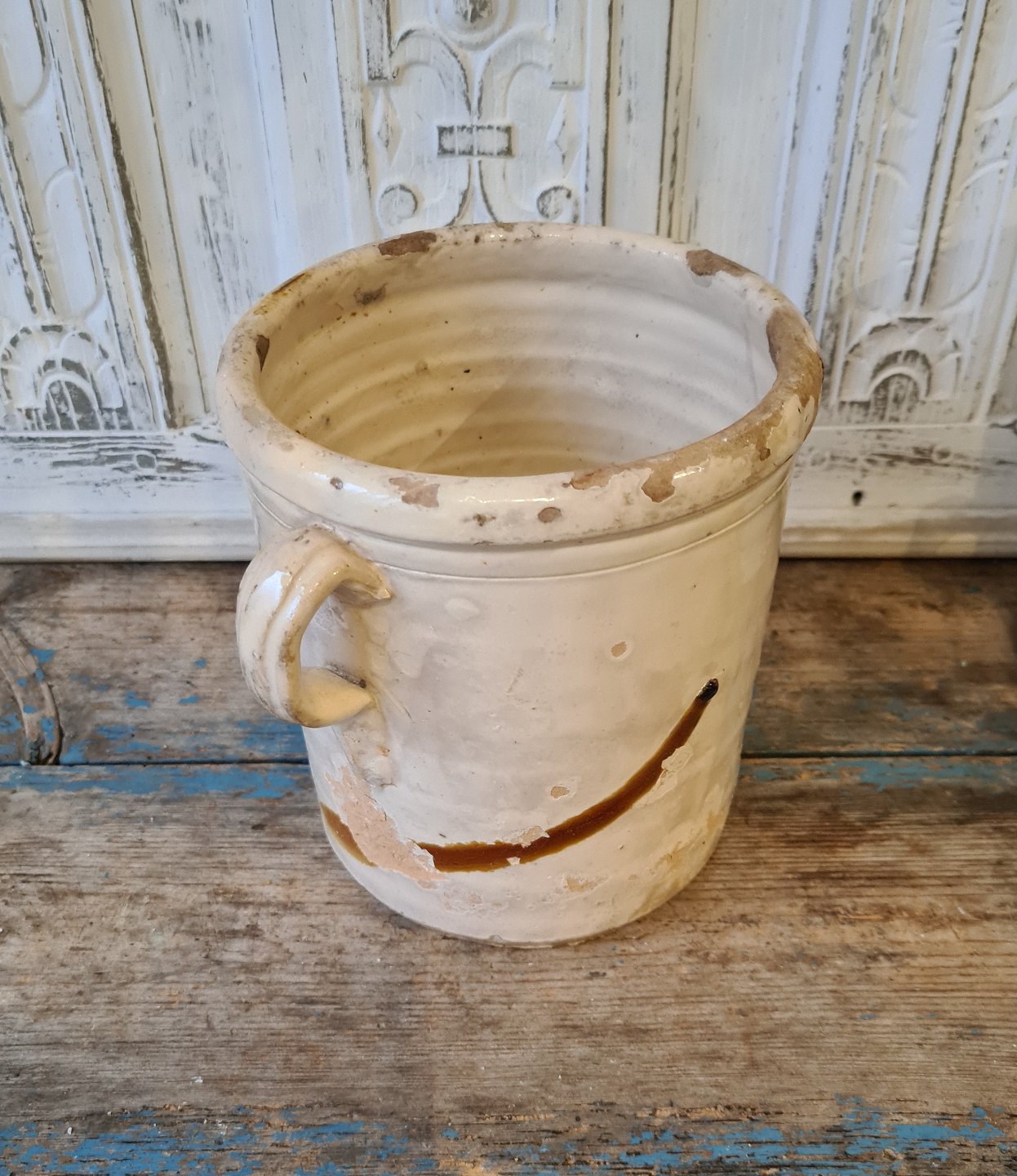 Smuk gammel lertøjskrukke med skøn cremefarvet glasur.