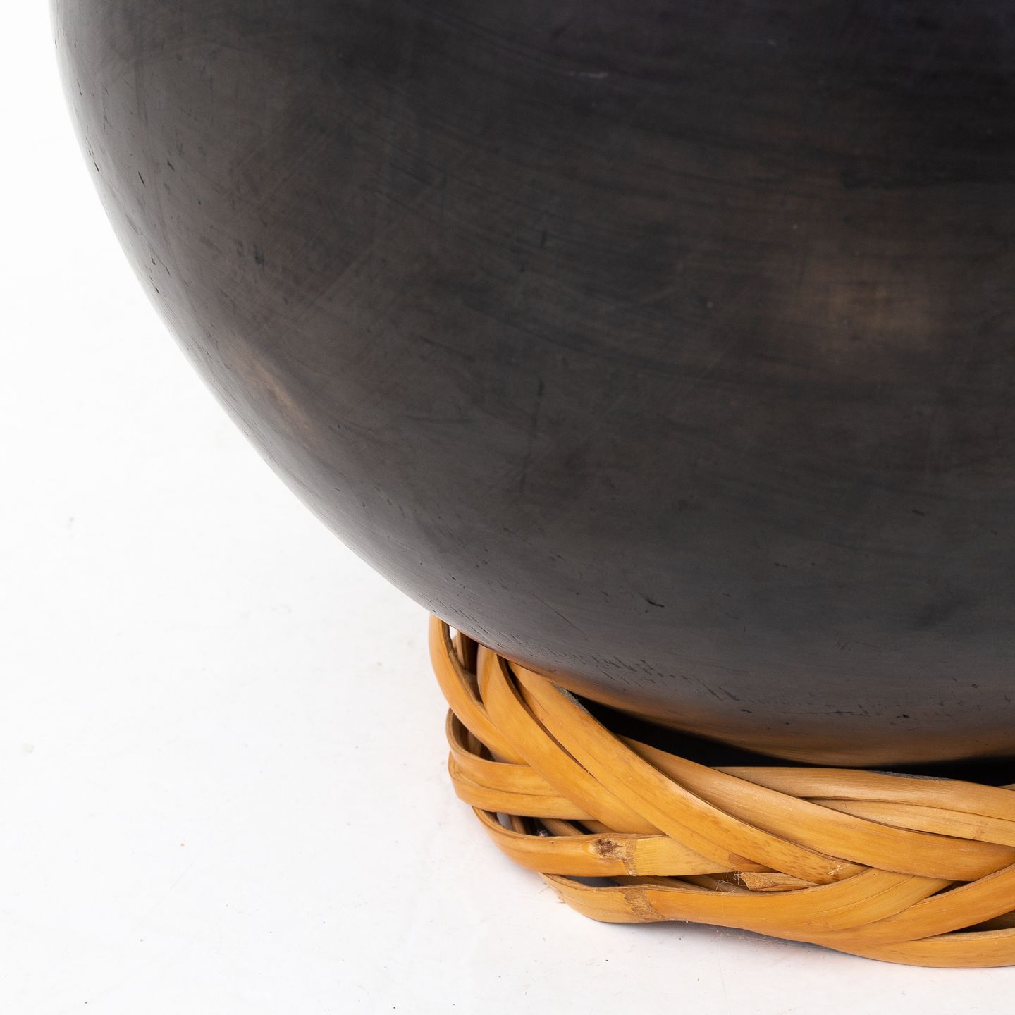 Stor rundbundet krukke i mørkbrændt lertøj på base i flettet bambus.