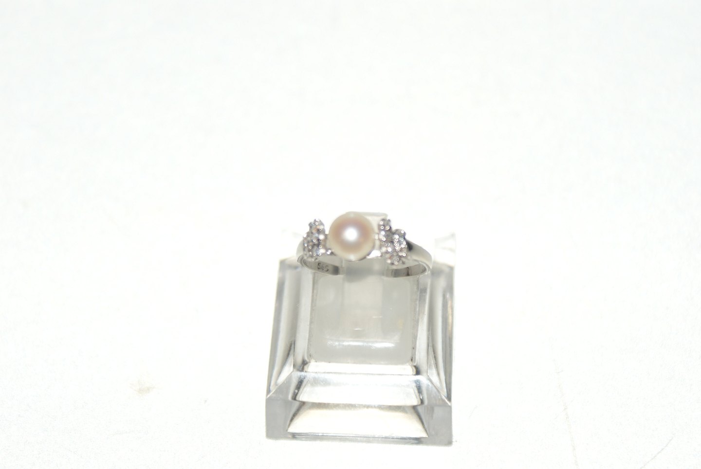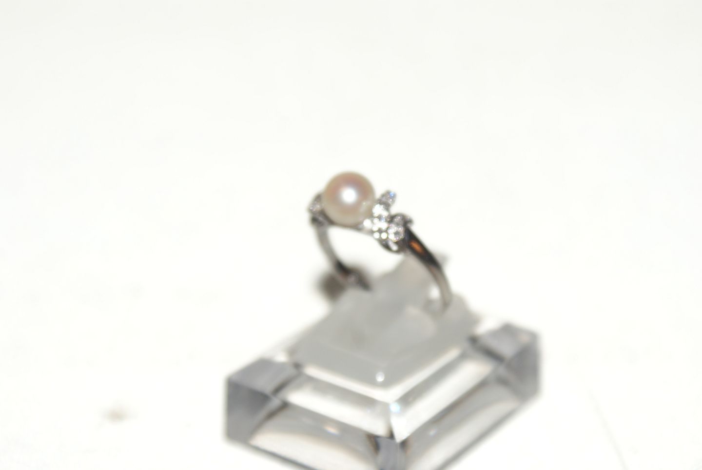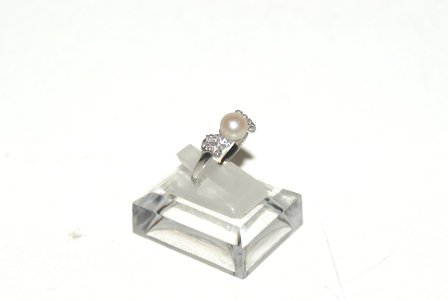 Ladies' ring with pearl and diamonds in 14 carat white gold