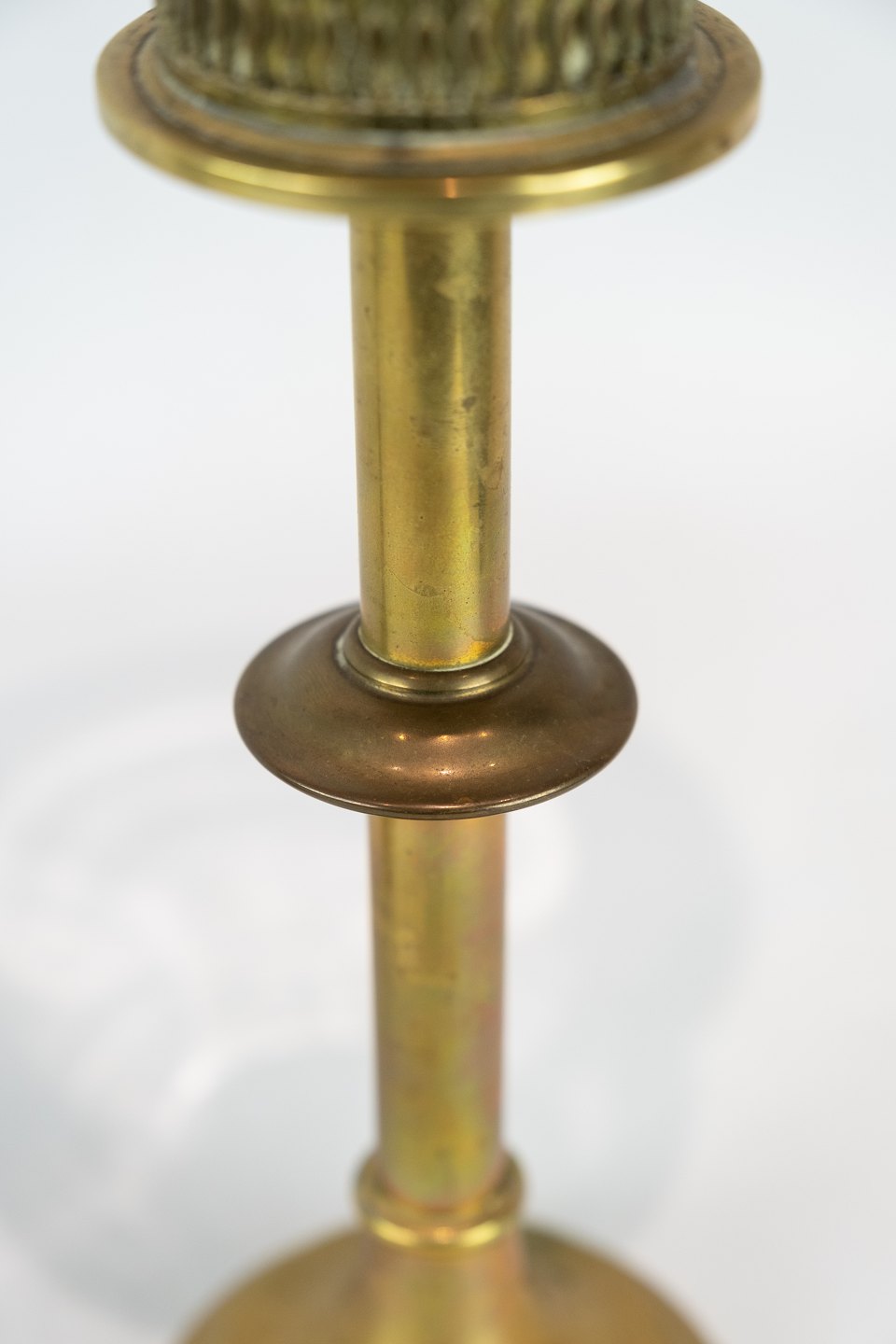 Et par Hurricane lysestager af messing og glas fra 1930erne, begge i flot brugt stand.