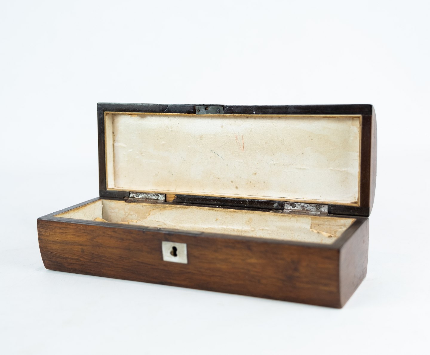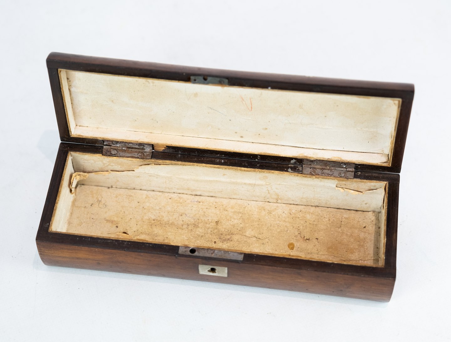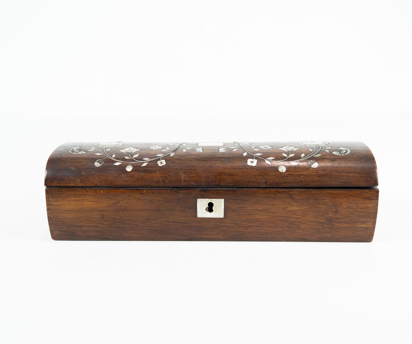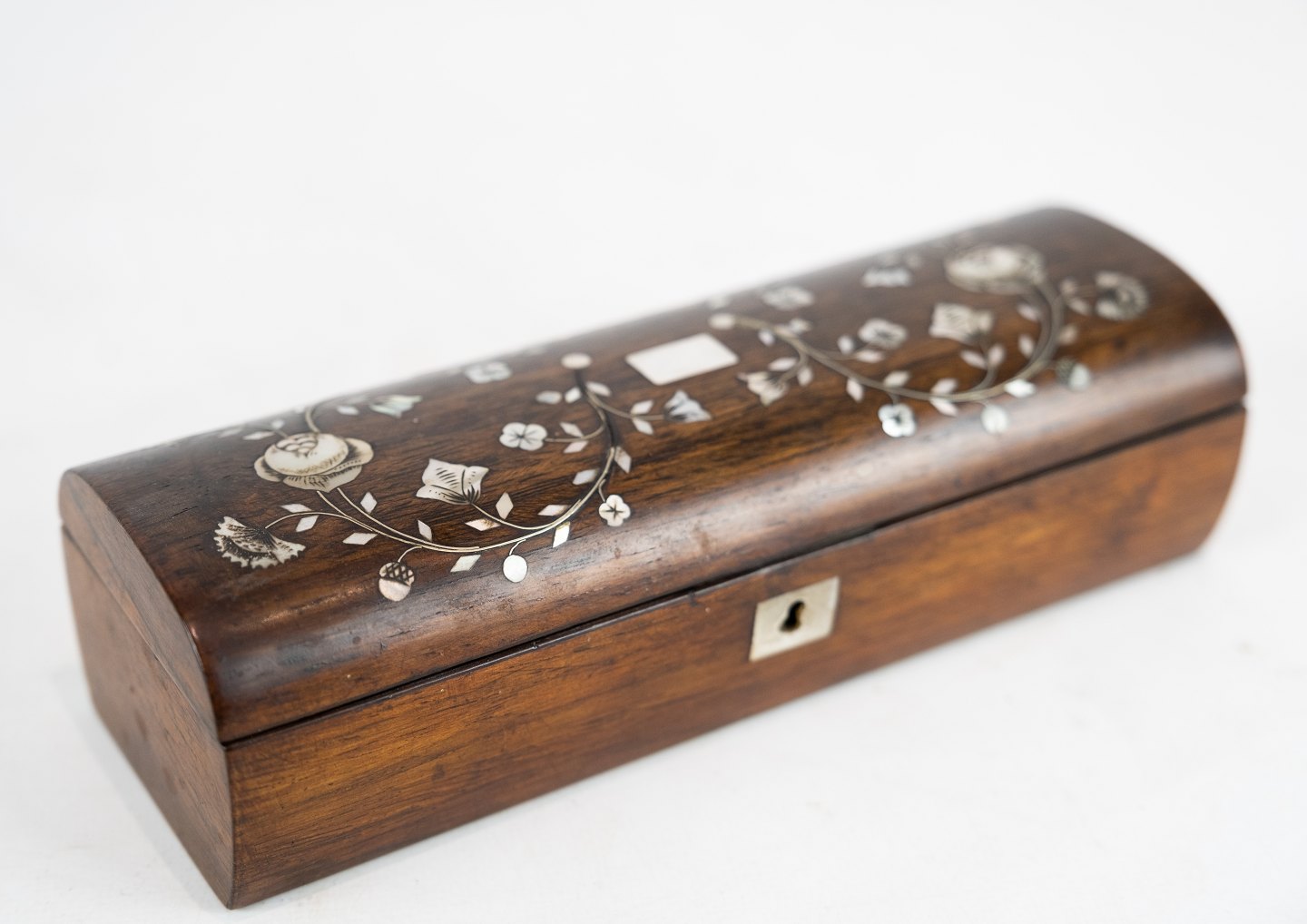 Mindre aflangt skrin i palisander udsmykket med perlemor. Skrinet er fra 1880erne.