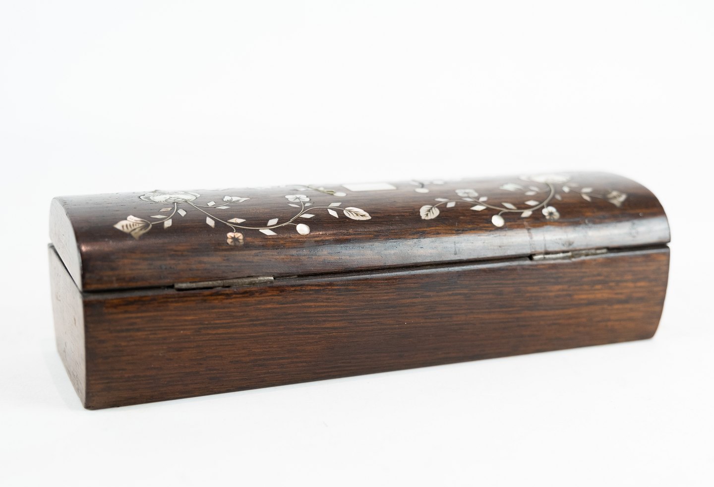 Mindre aflangt skrin i palisander udsmykket med perlemor.
