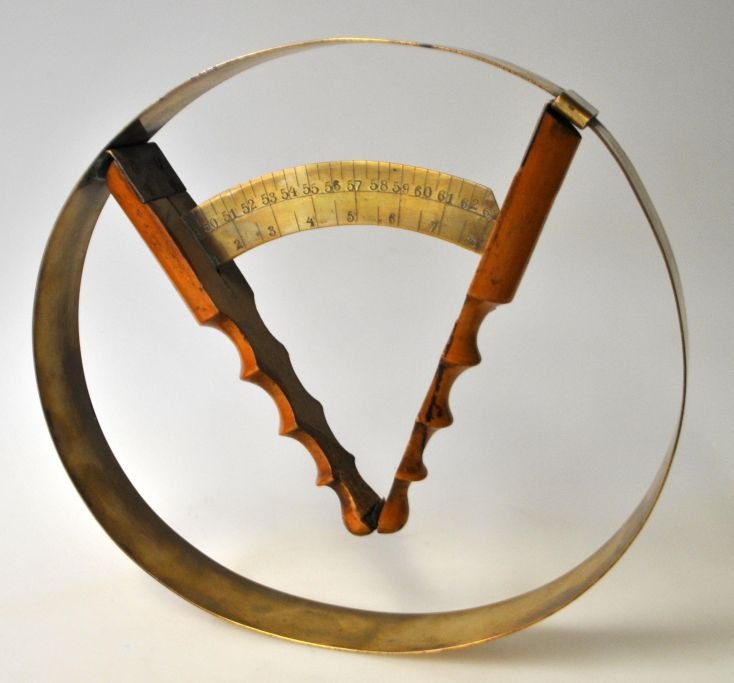 Antik hattemåler, 19. årh. Danmark. Messingring, træhåndtag og måleinstrument. Kan måle fra størrelse 49 - 63. Udtrukket diameter: 19 cm.