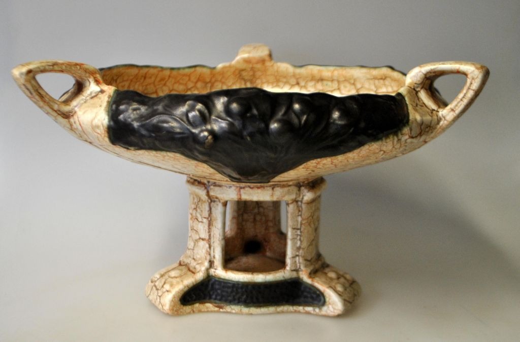 German Art Nouveau table bowl, approx. 1900. Red clay. With three handles. On three-part foot. Decorated in carquele glaze and black glaze. With typical decorations with shrubs and berries. Unclearly stamped. H .: 15 cm. Dia .: 23.5 cm. Perfect condition!