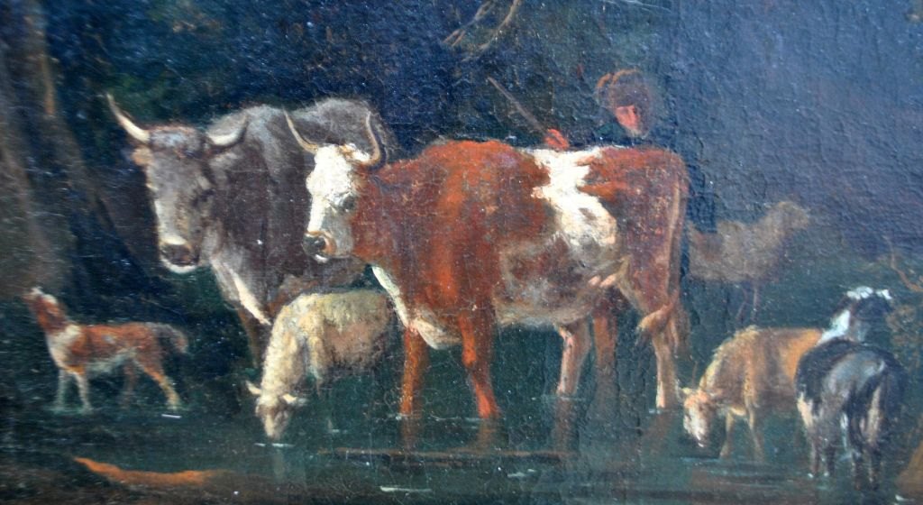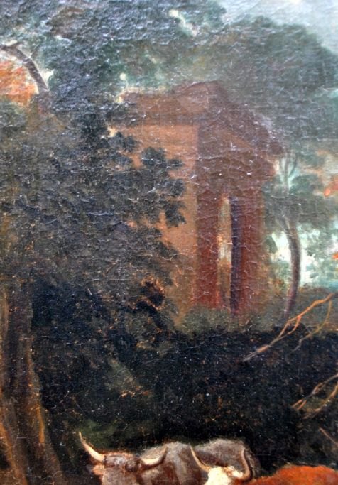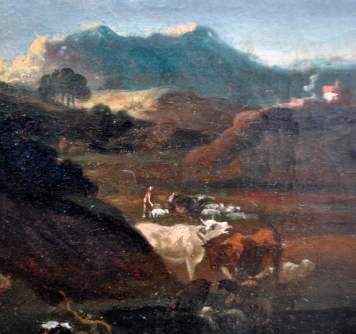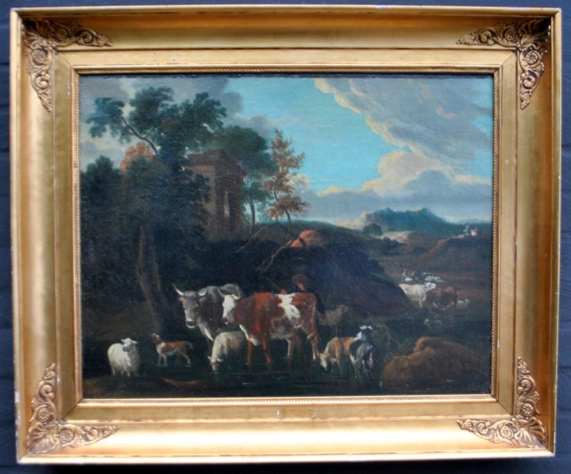De Rosa, Gaetano (Cajetan Roos), (1690 - 1770) Italy: Landscape with shepherds and heard by a river, with ruins and a town. Oil on canvas. Unsigned. 49 x 63 cm.