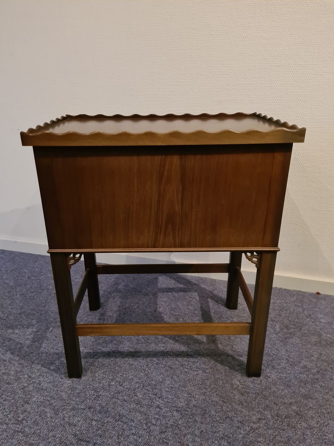 Kommode i fineret mahogni fra 1980erne, den har et lille nøk på hjørnet.