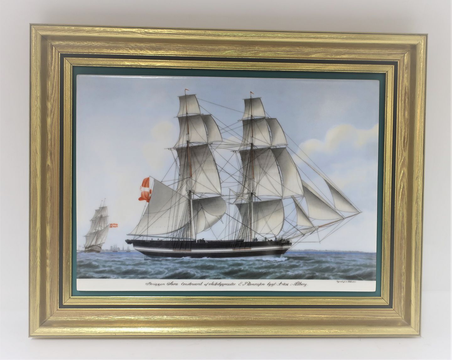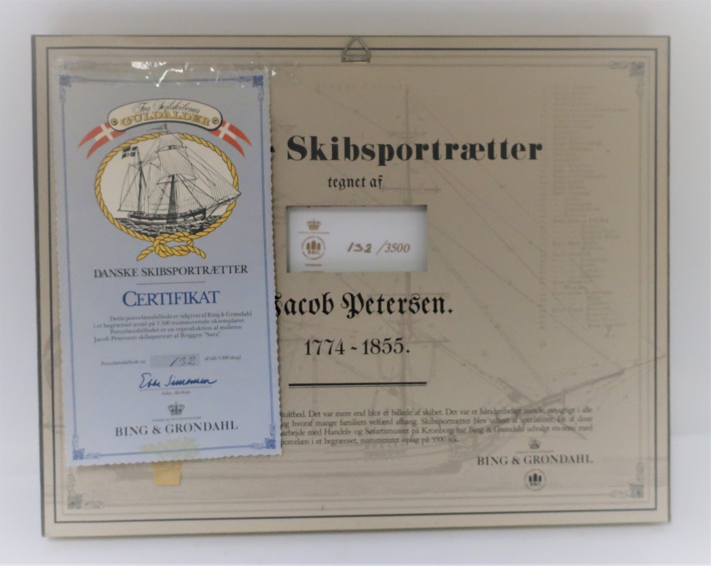 Bing & Grøndahl. Porcelæn. Danske skibsportrætter. Billed af Briggen "Sara". Mål : Bredde 38* 30 cm. Der er produceret 3500, og denne er no. 132.