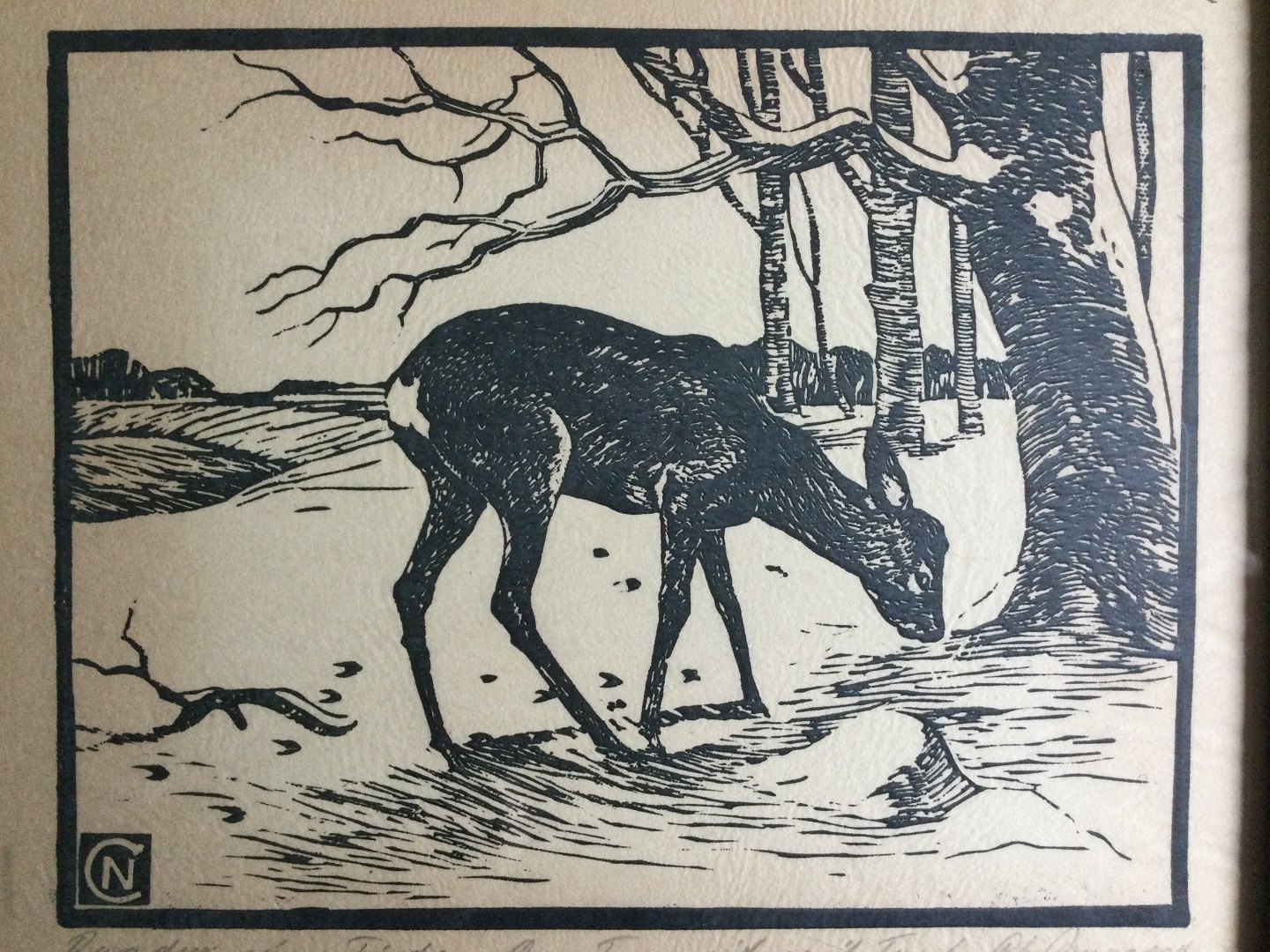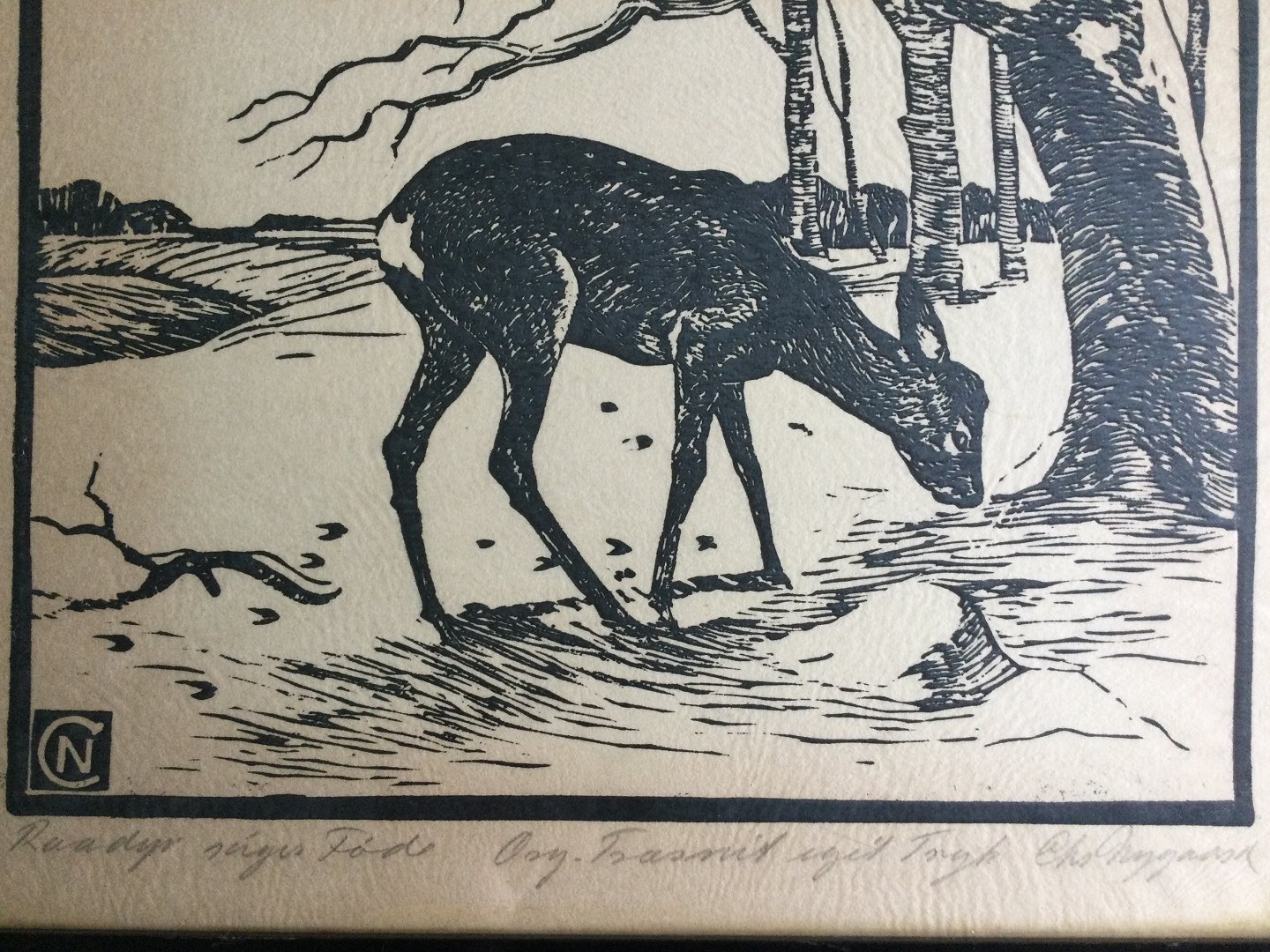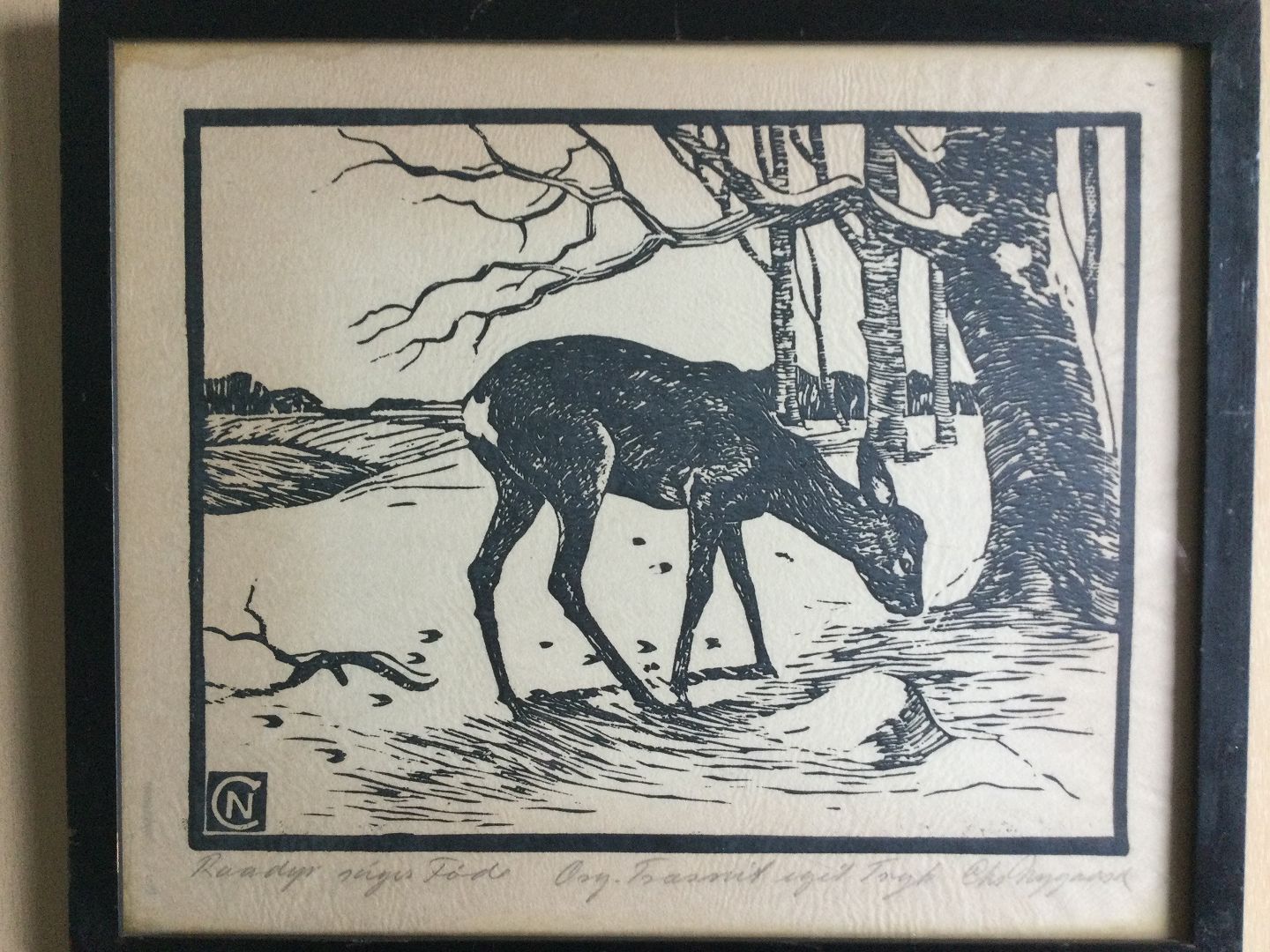 Træsnit Christian Nygaard - Rådyr søger føde.