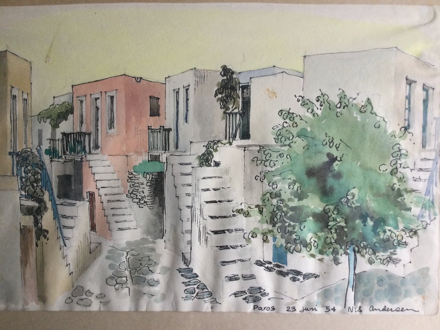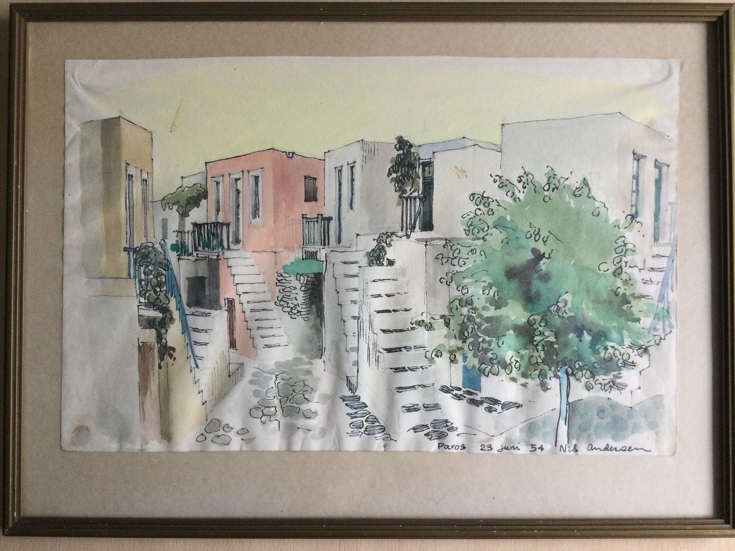Akvarel af Nis Andersen - Parti fra Paros 1954.