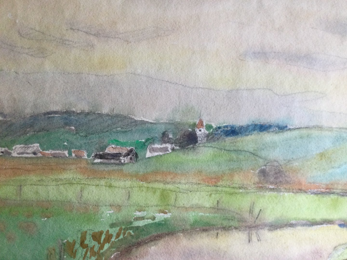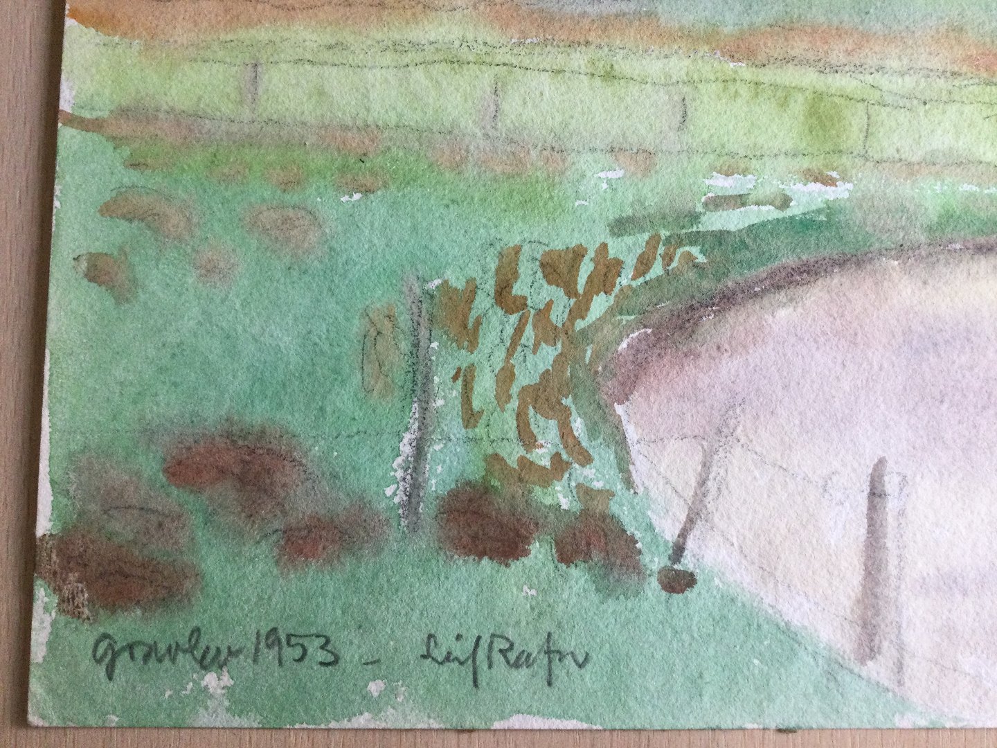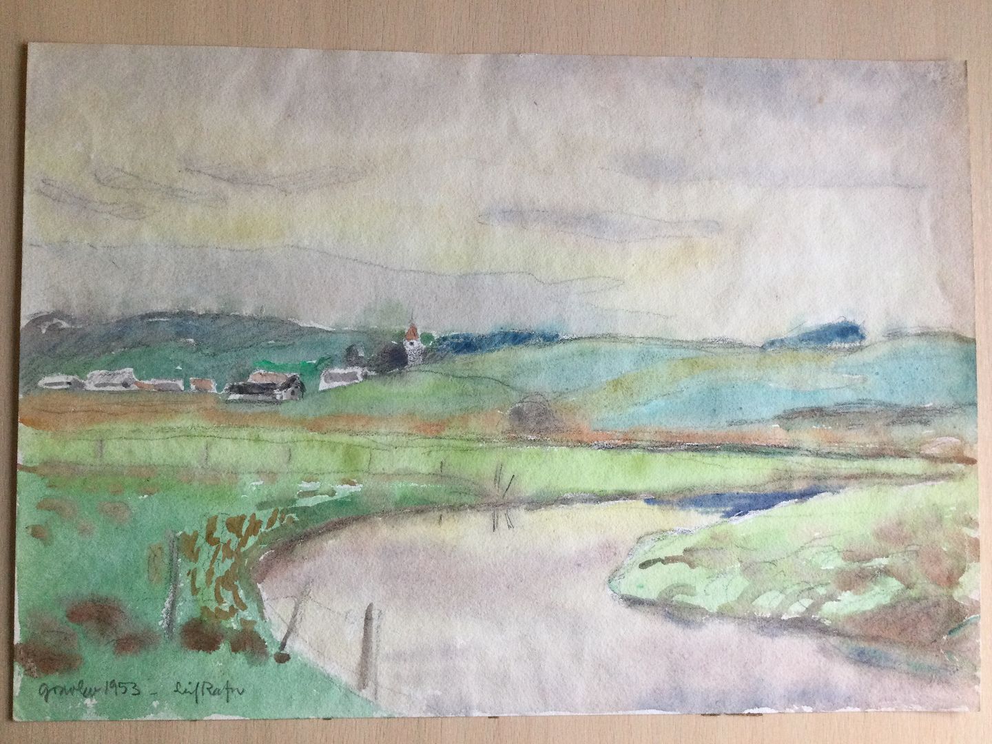 Akvarel af Leif Rafn - Vue ind over Gravlev by 1953.