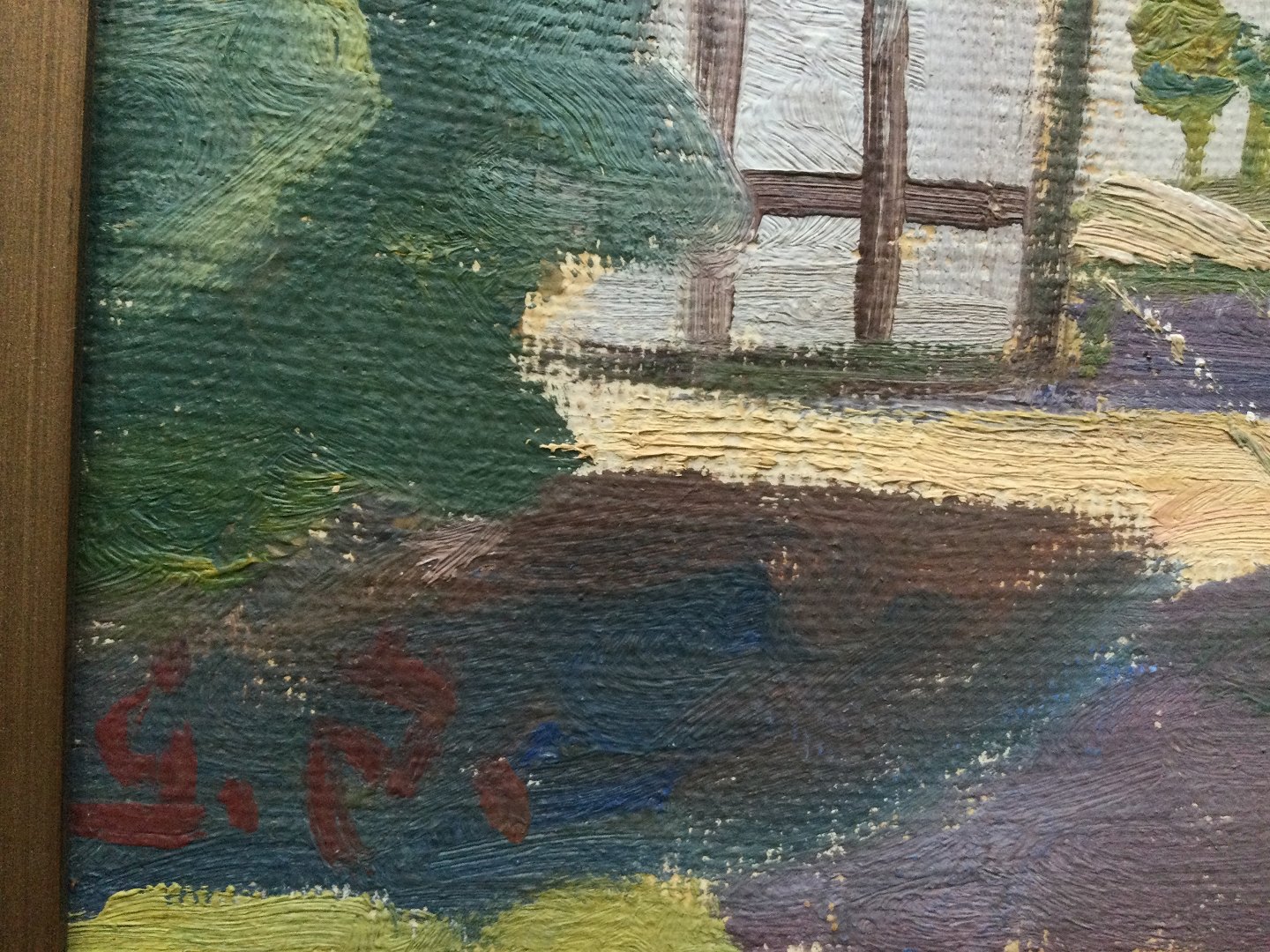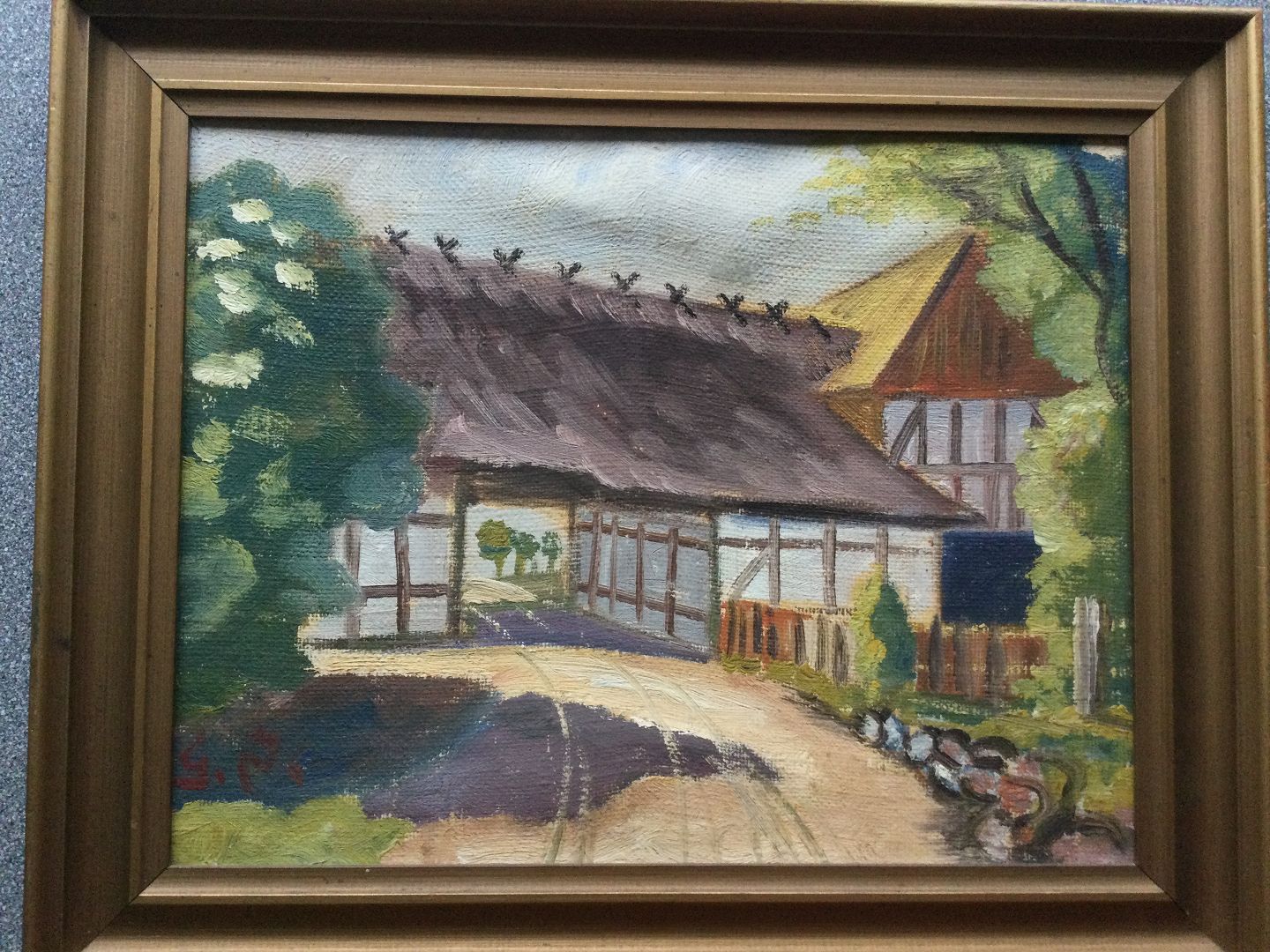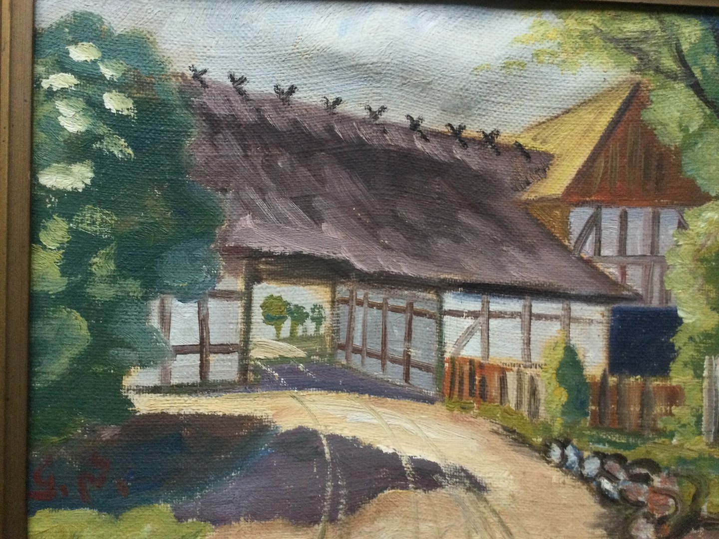 Maleri af Georg Jensen - Bindingsværksgård Bornholm 1956.