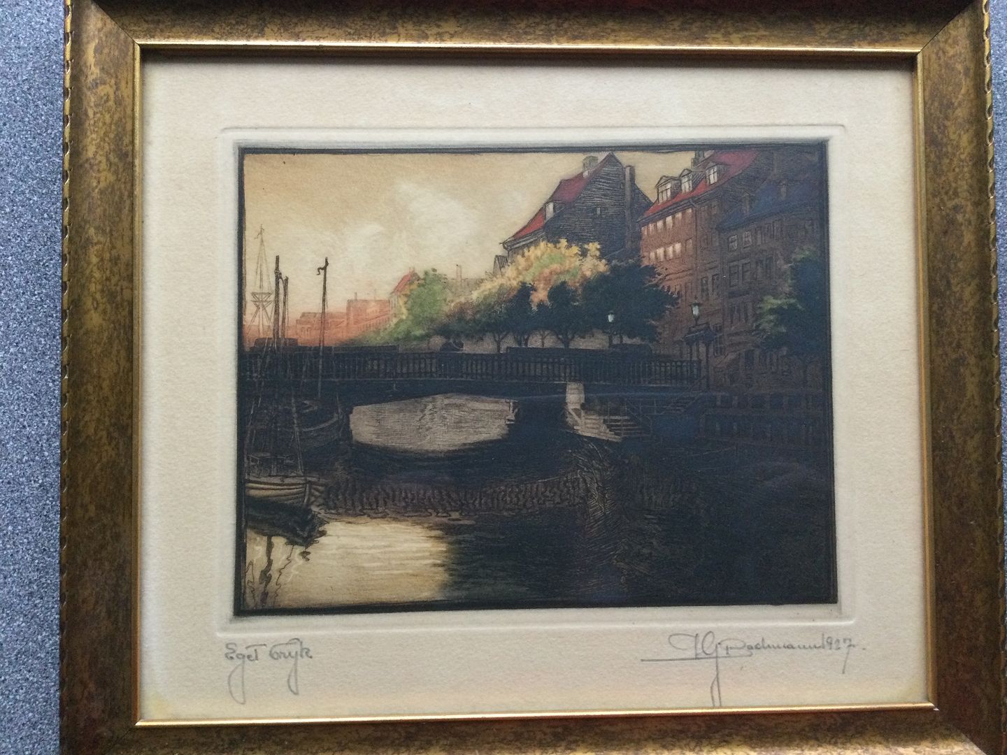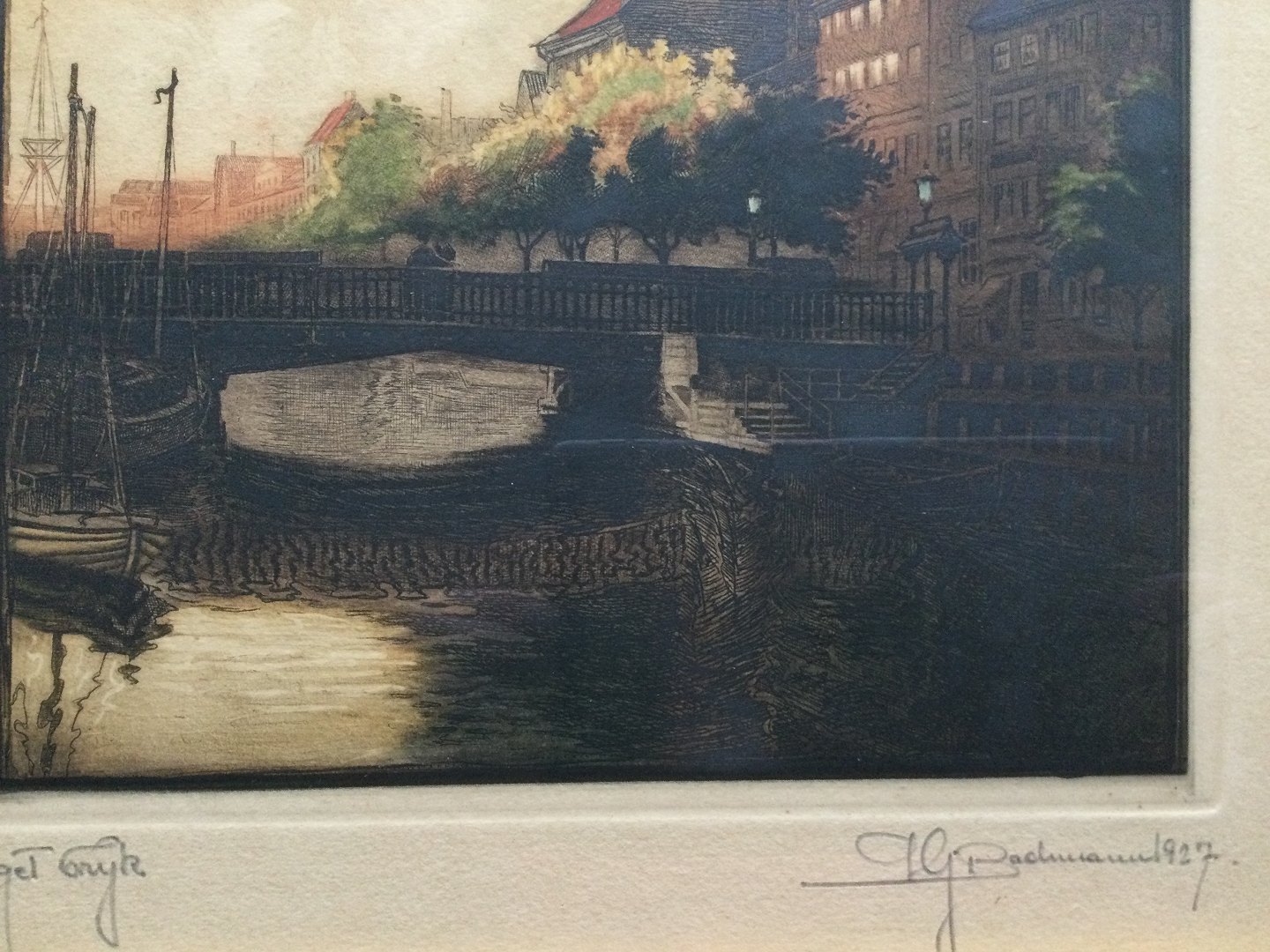 Radering Hjalmer Bachmann - kanalparti, København 1927.