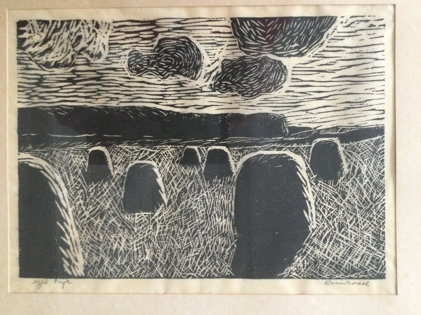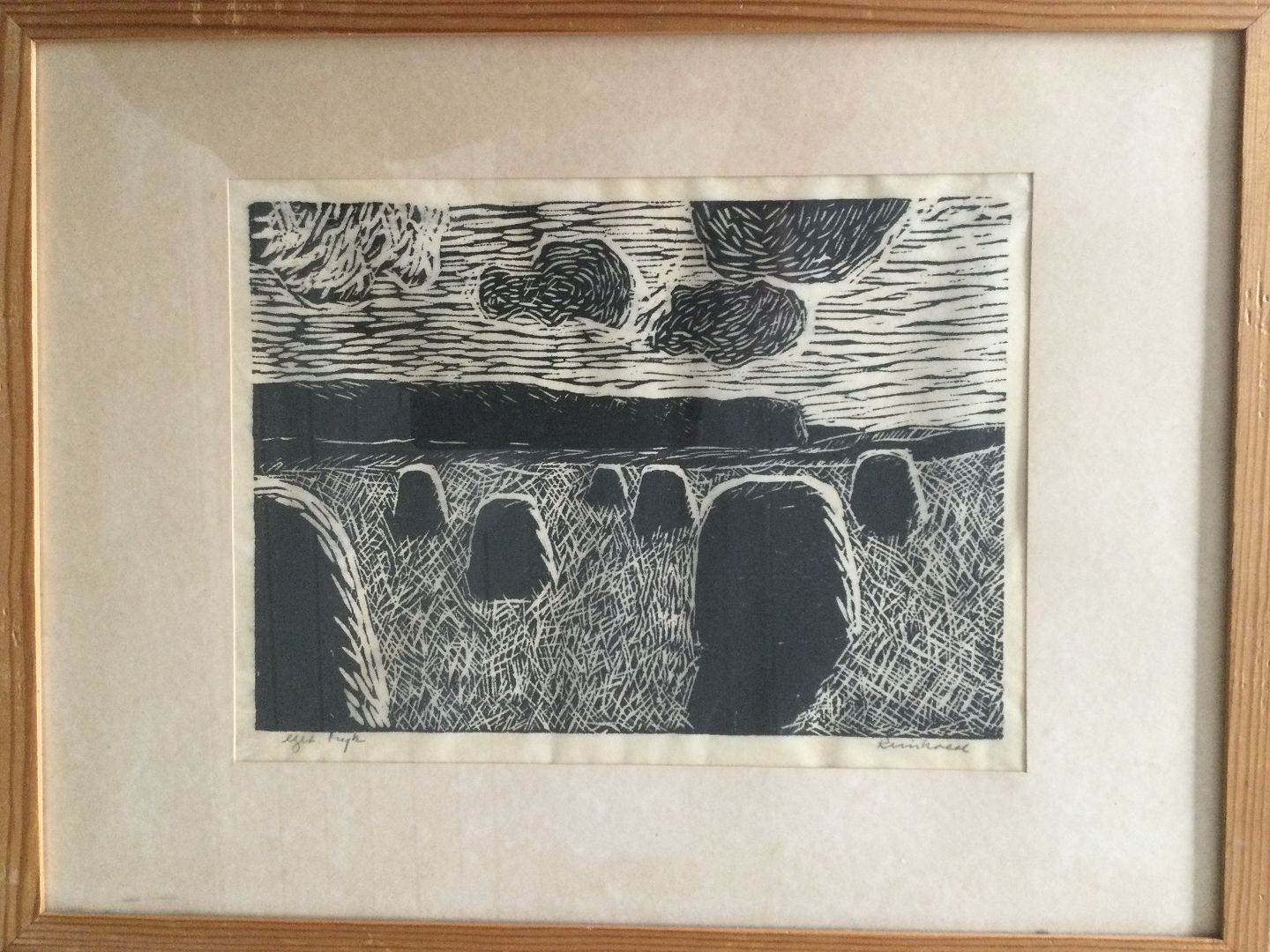 Træsnit af Harald Reinhold - Ny høstet mark.
