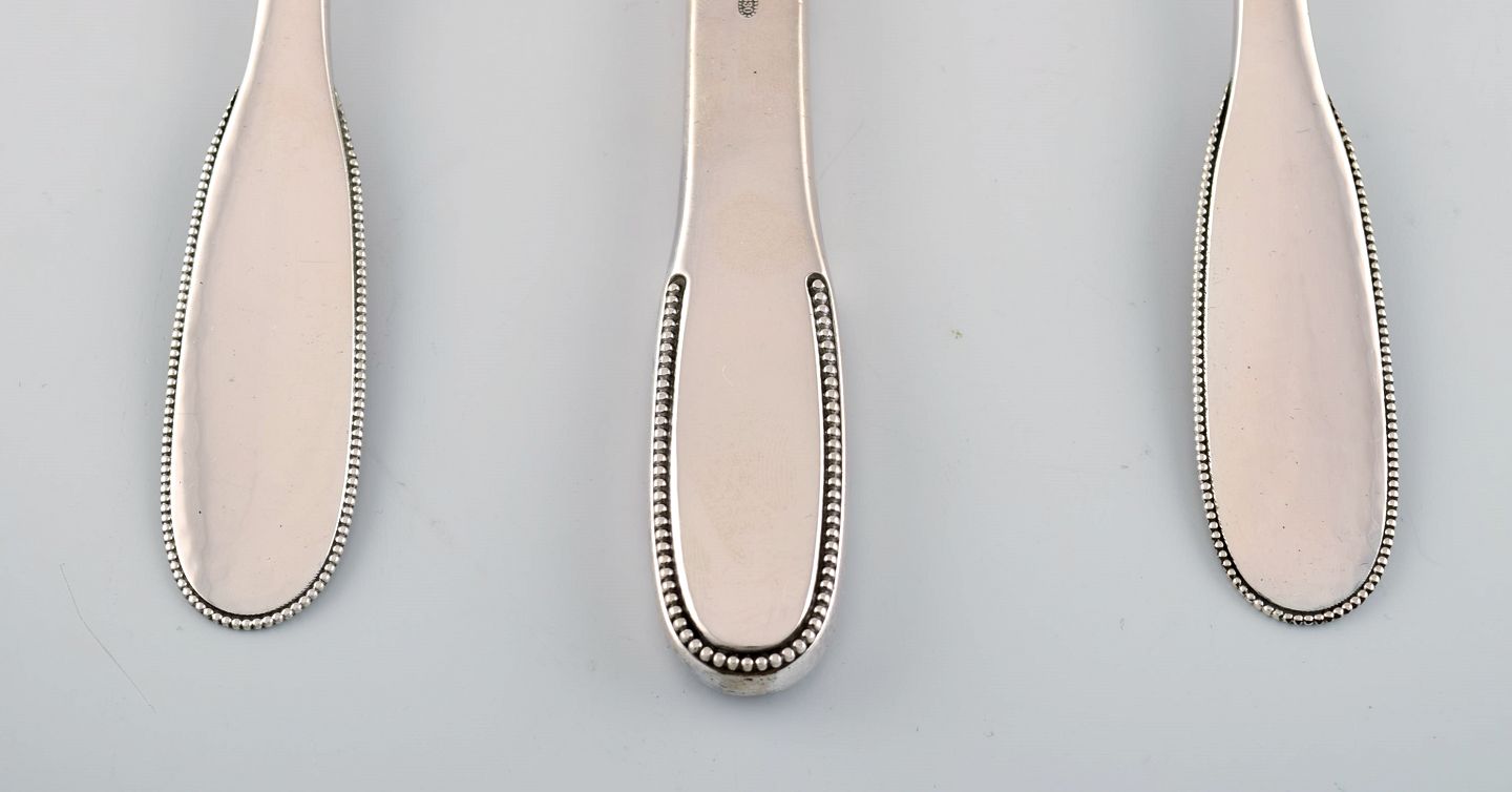 Evald Nielsen nummer 14 middagsservice i hammerslået sølv (830) til seks personer. 1920'erne.