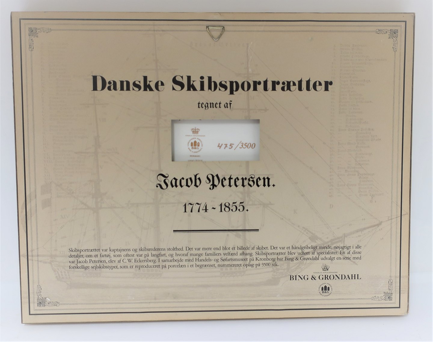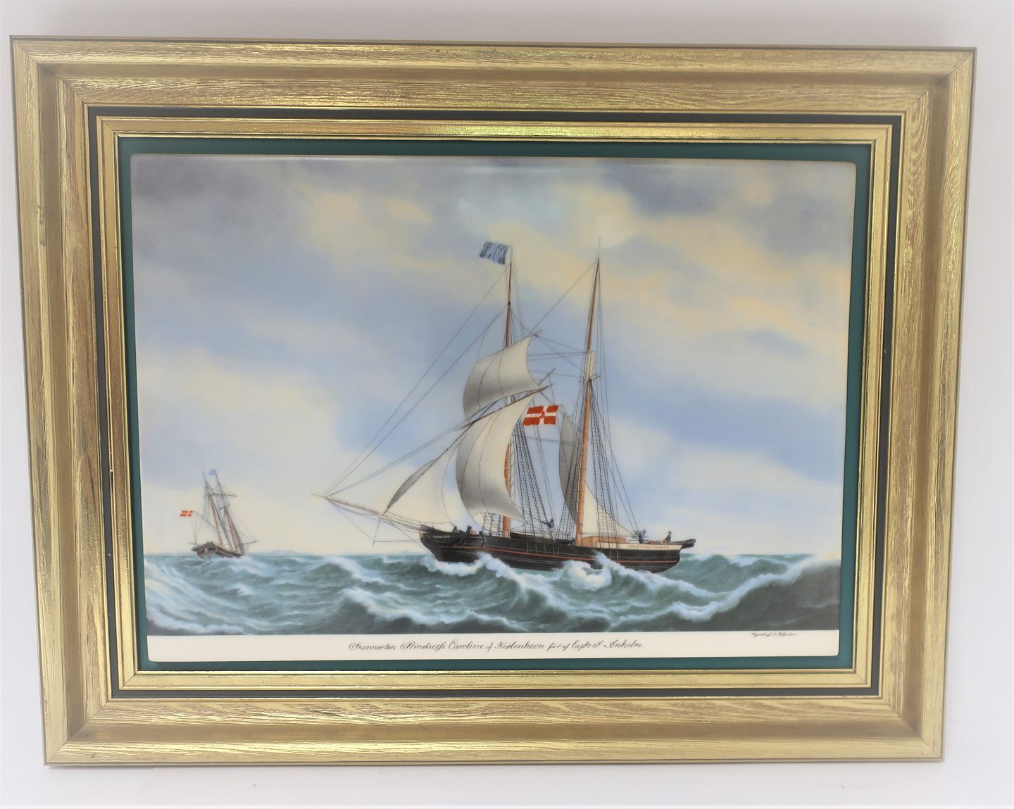 Bing & Grøndahl. Porcelæn. Danske skibsportrætter. Billed af "Skonnerten Prinsesse Caroline af Kjøbenhavn. Mål : Bredde 38* 30 cm. Der er produceret 3500, og denne er no 475.