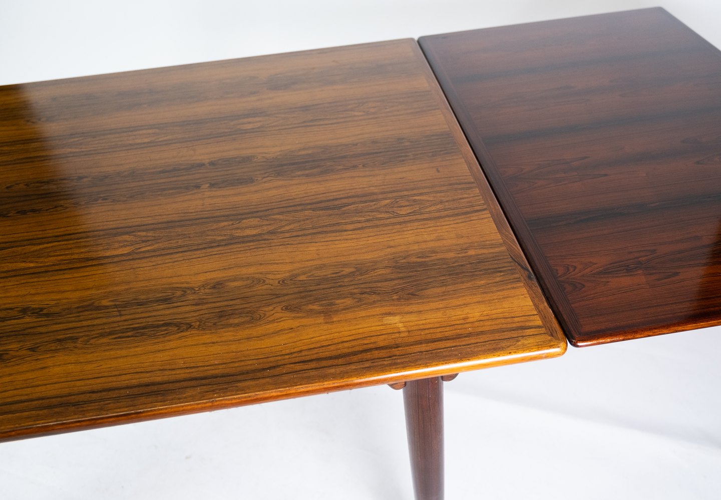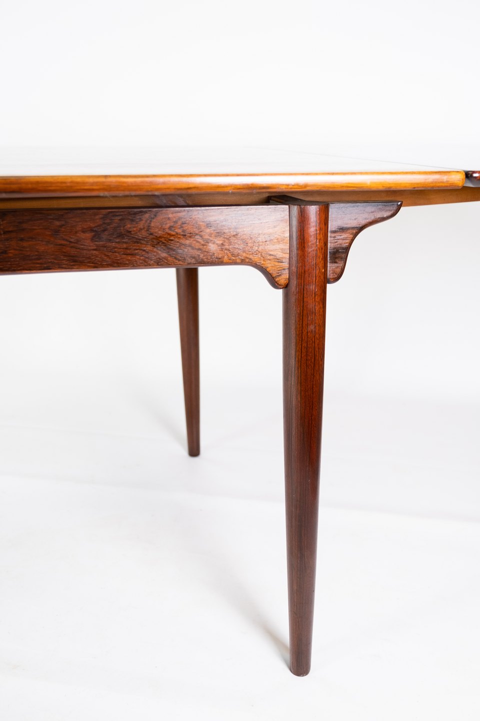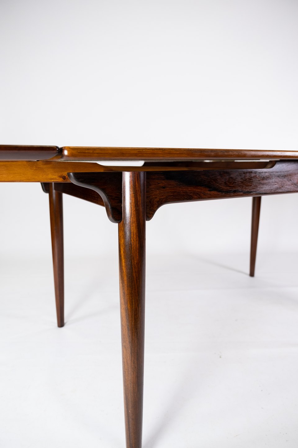 Dette spisebord i palisander, designet af Arne Vodder i 1960'erne, er et smukt eksempel på dansk møbelkunst fra midten af det 20. århundrede. Palisandertræet giver bordet en varm og naturlig glød, mens det hollandske udtræk tilføjer praktisk funktionalitet.