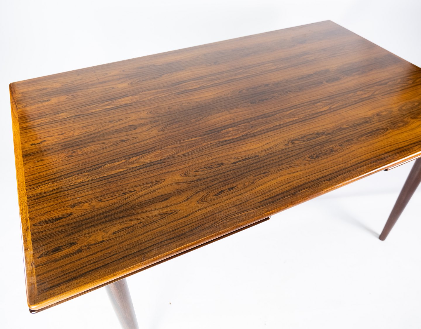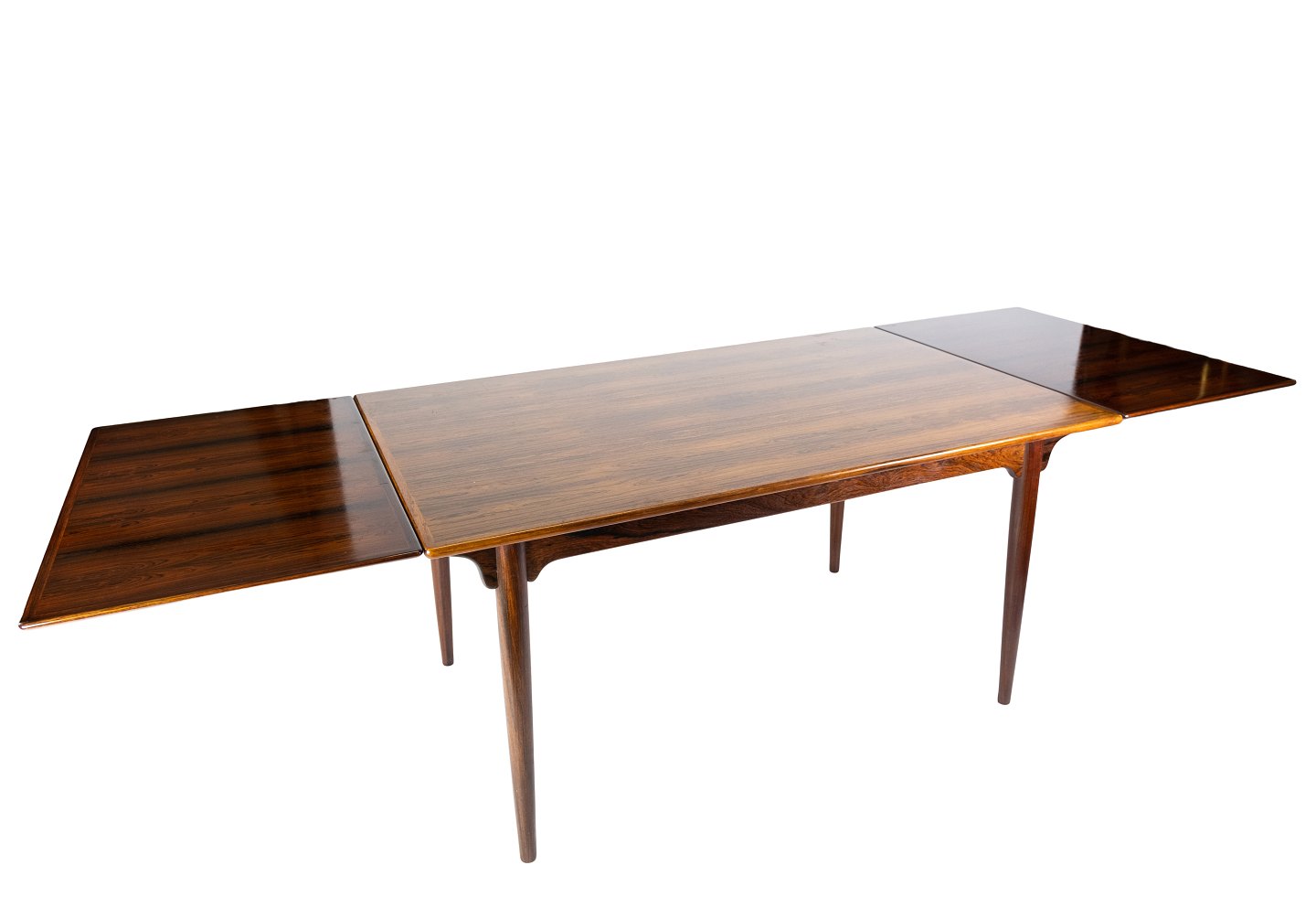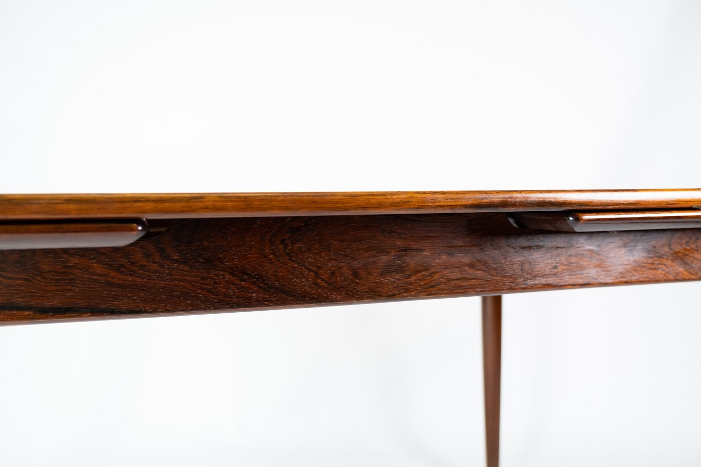 Dette spisebord i palisander, designet af Arne Vodder i 1960'erne, er et smukt eksempel på dansk møbelkunst fra midten af det 20. århundrede. Palisandertræet giver bordet en varm og naturlig glød, mens det hollandske udtræk tilføjer praktisk funktionalitet.