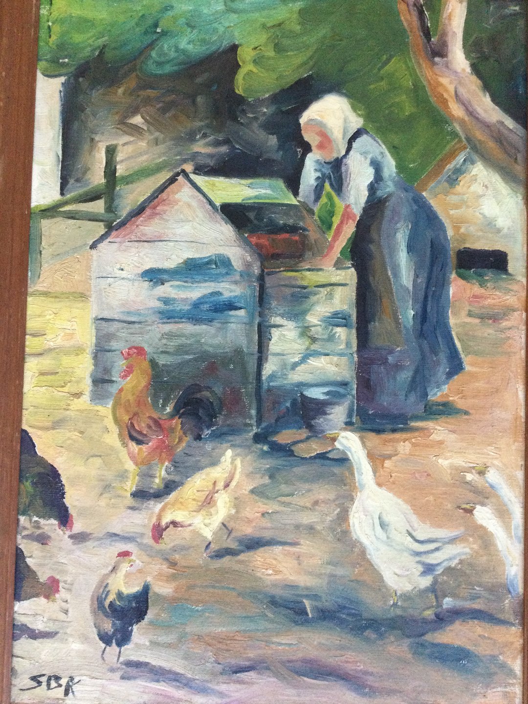 Maleri af Sigrid Bech-Knudsen - Arbejdende kone på gårdsplads med høns og ænder.