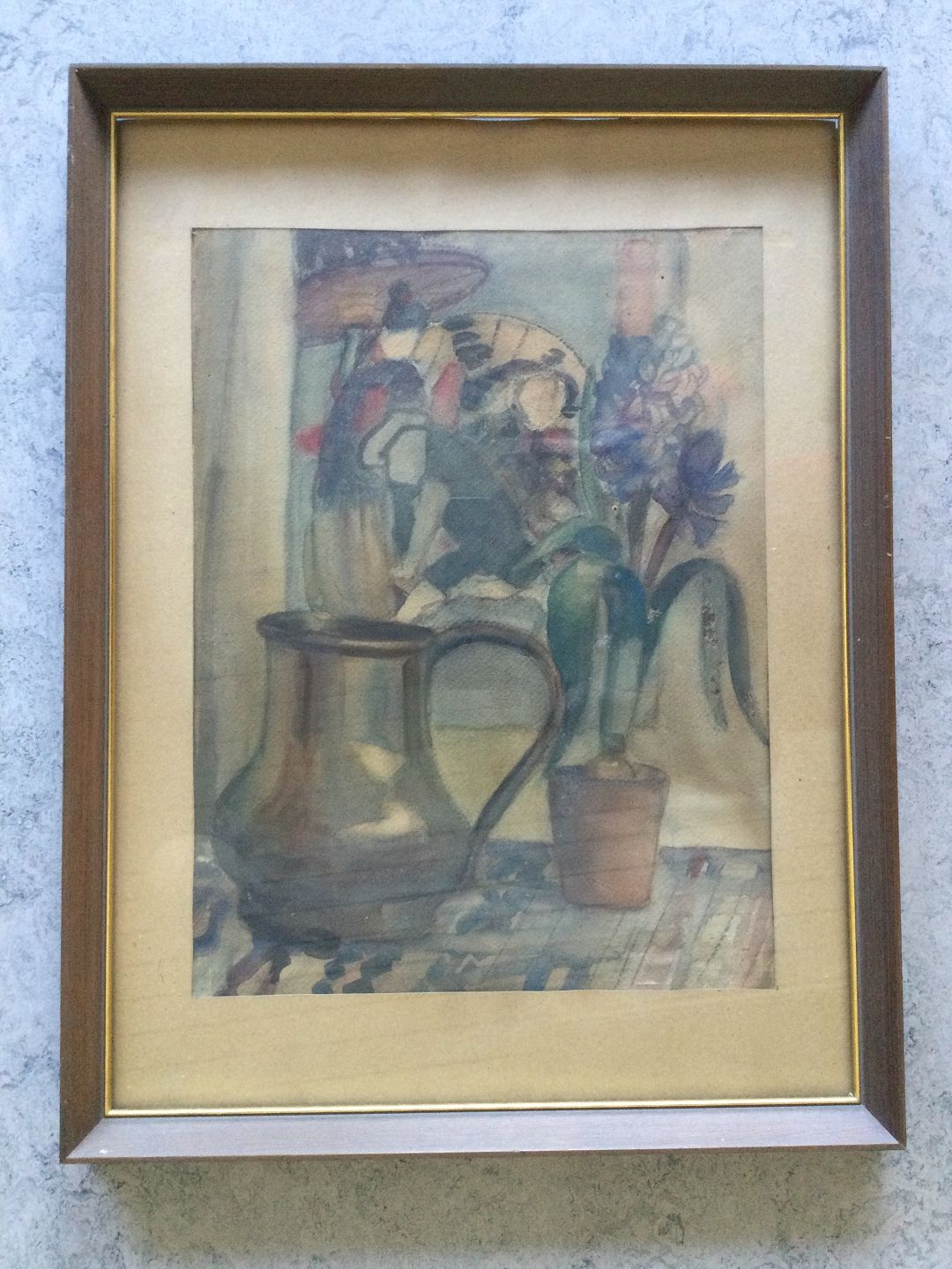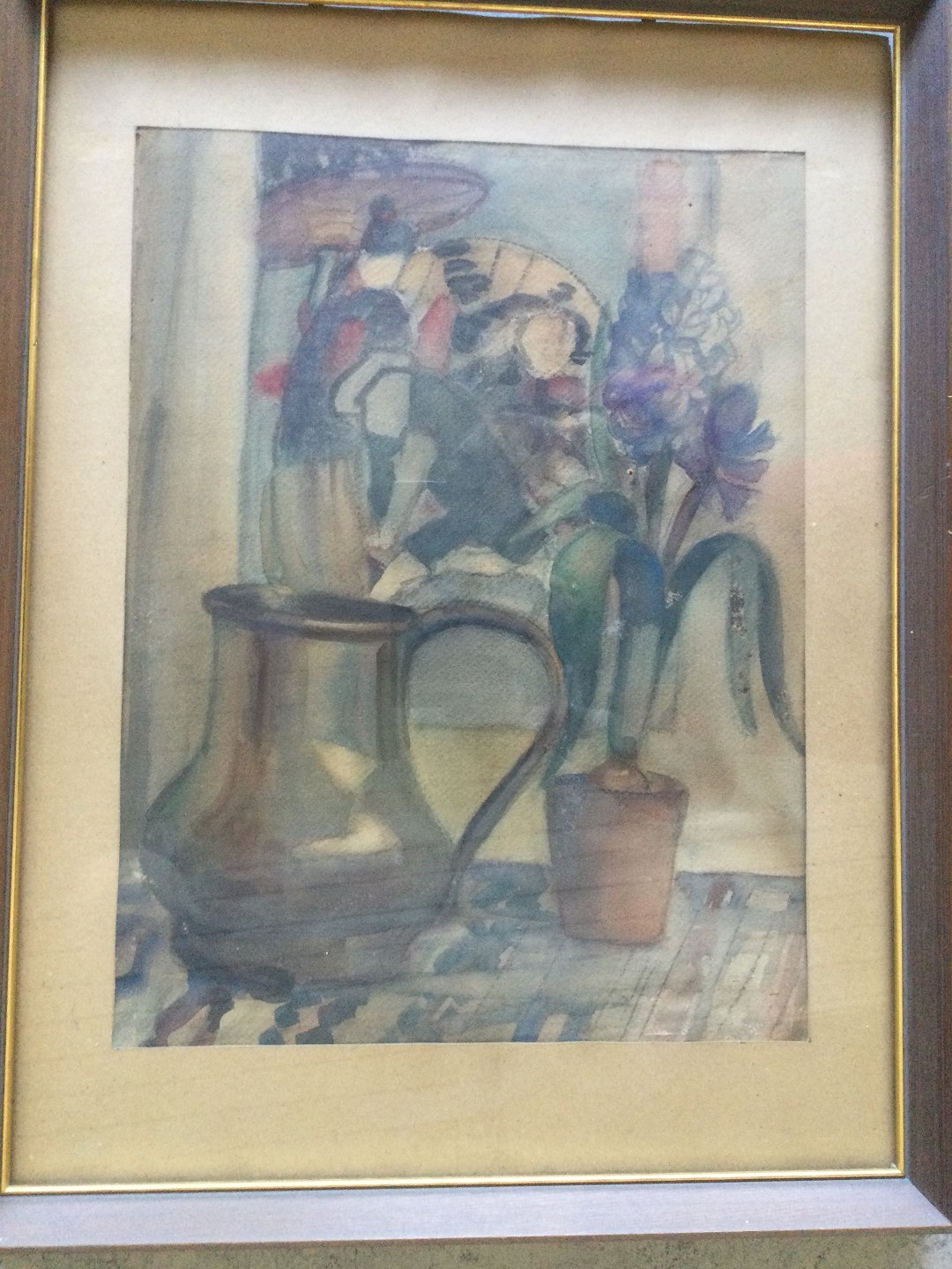 Akvarel - Kande samt potte med blå hyacint på bord.