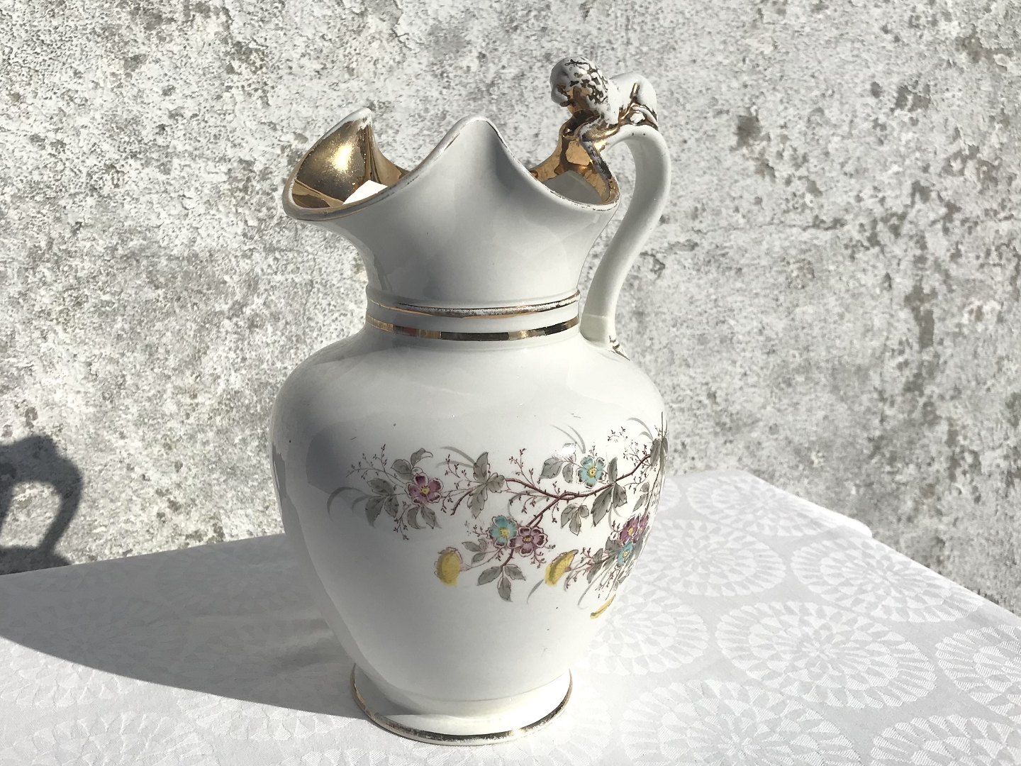 Chocolate jug, Flower decorated and lion handle, 25cm high, 16cm in diameter * Nice condition but with wear on the gold edge *