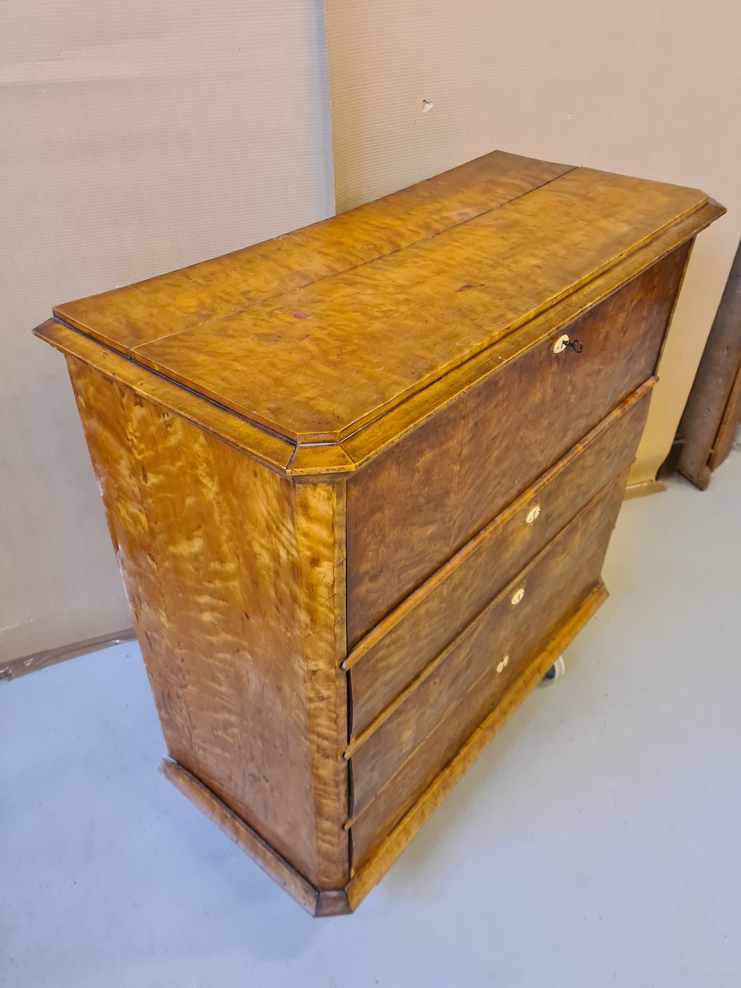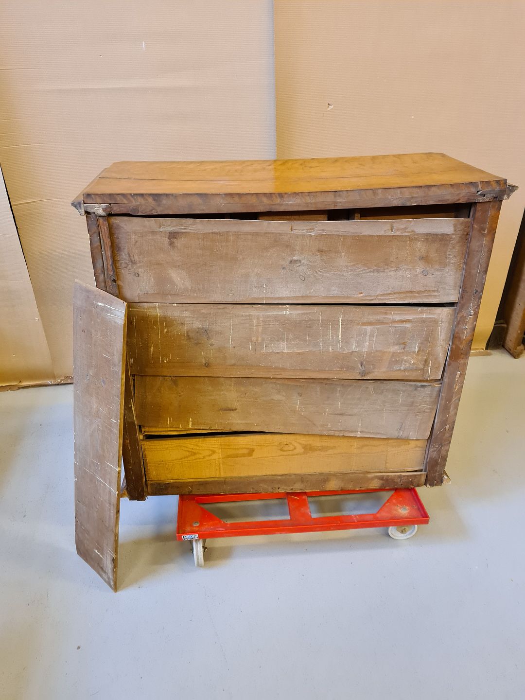 Kommode i fineret birketræ fra 1910erne. med brugsspor.