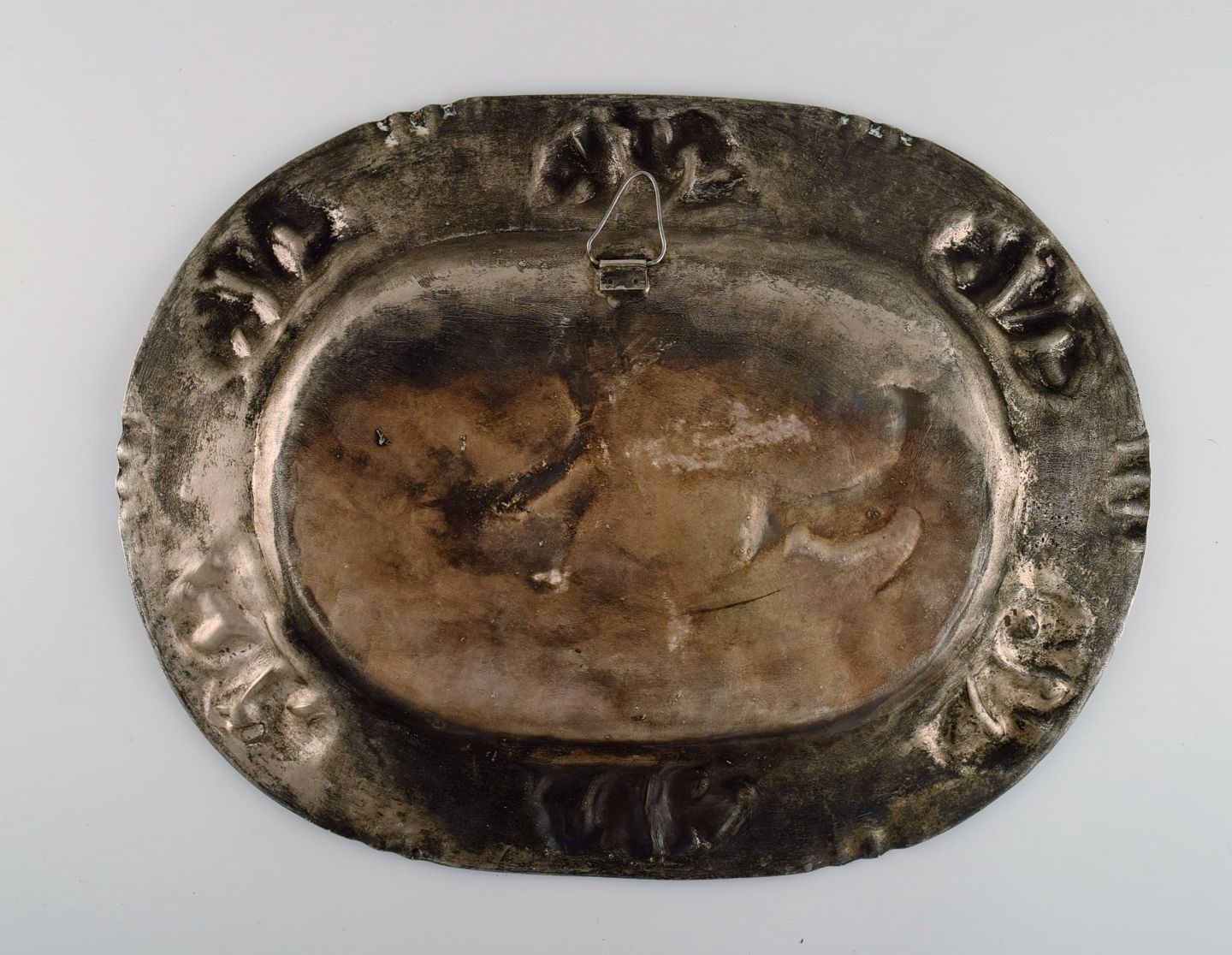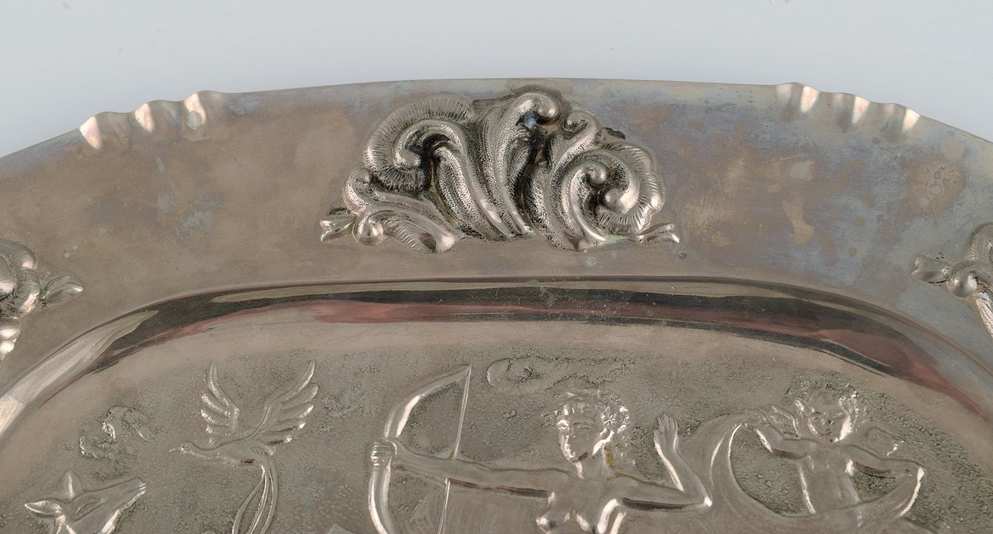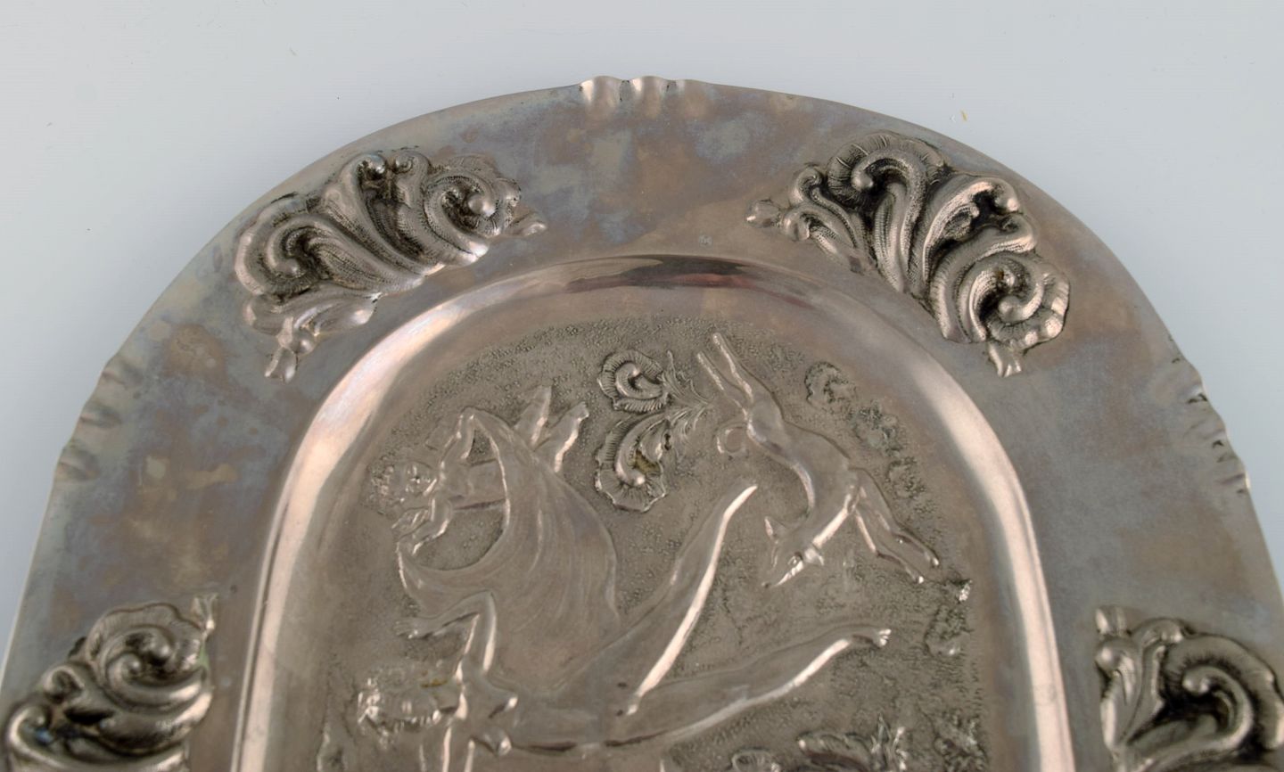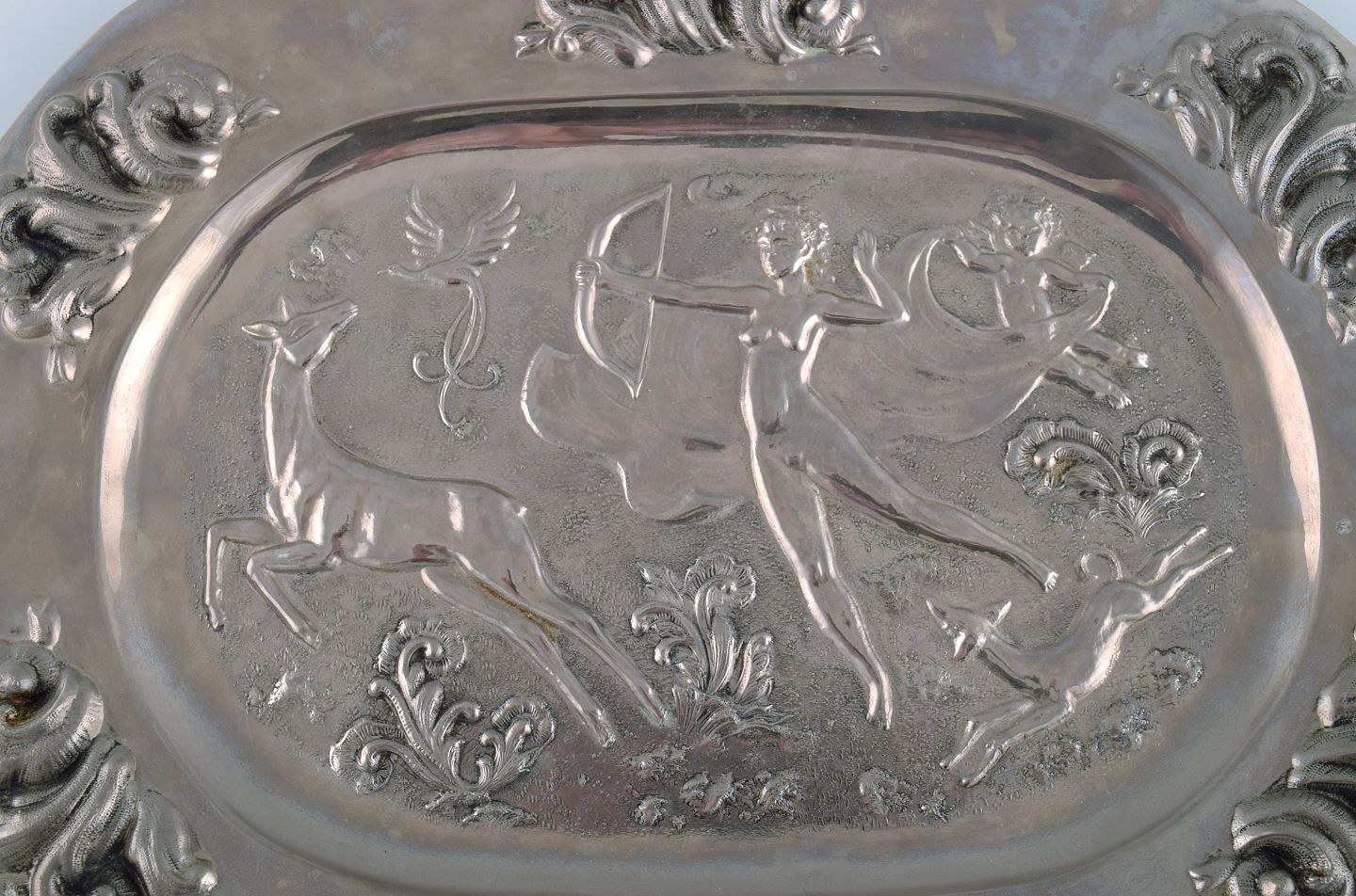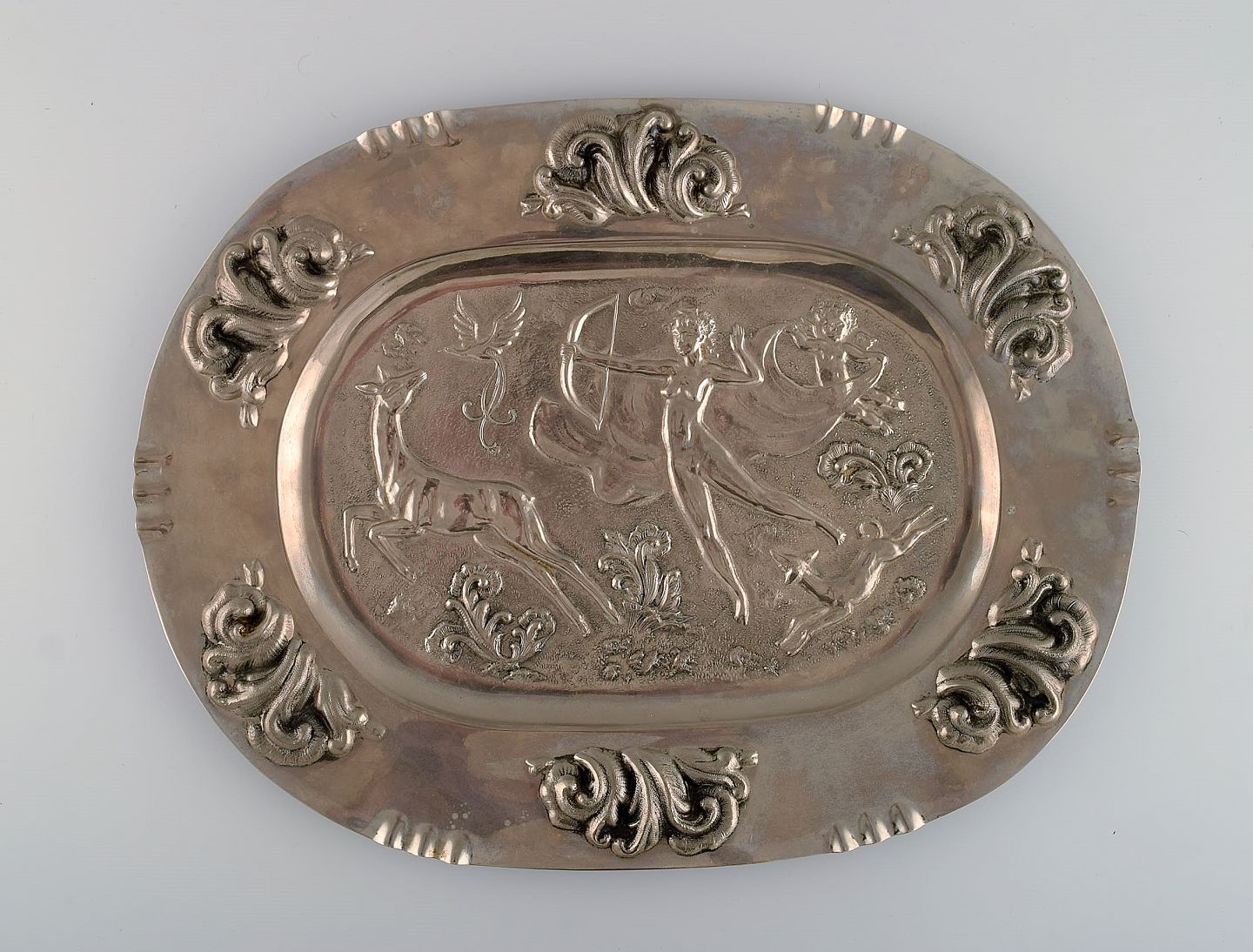 Svensk designer. Stort ovalt serveringsfad i metal med klassicistisk jagtscene. Swedish grace, 1910-1920.