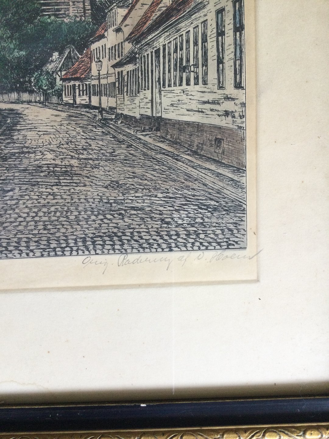 Radering af V. Holm - Parti fra Køge med kirken i baggrunden.