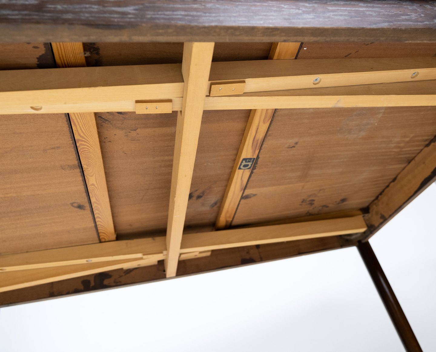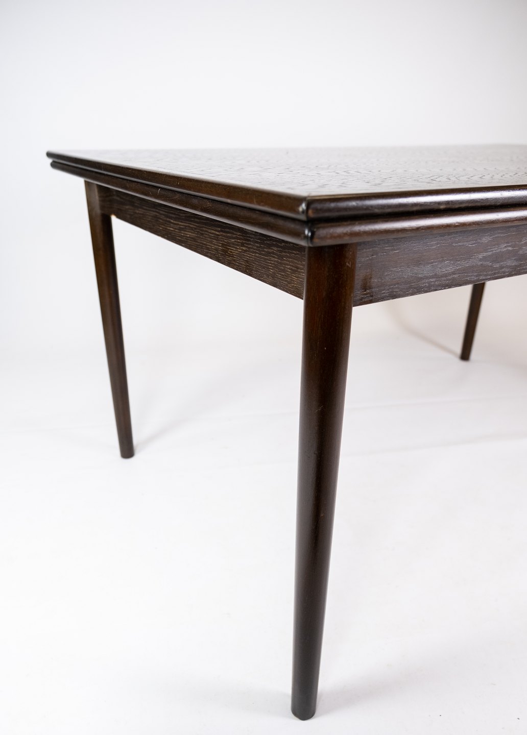 Spisebord i mørk eg med hollandsk udtræk af dansk design fra 1960erne. Bordet er i flot brugt stand.