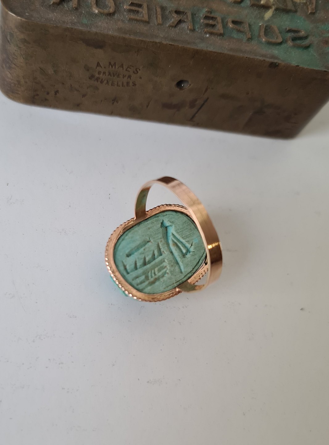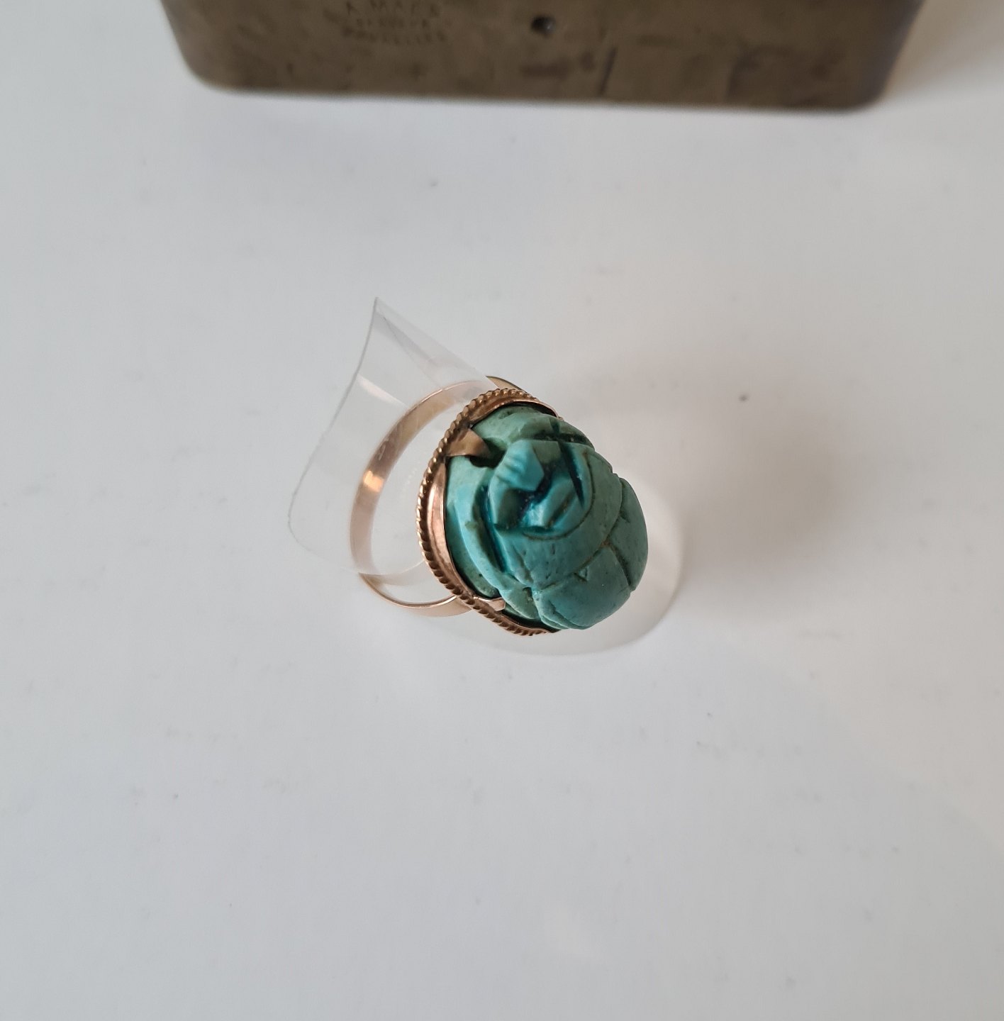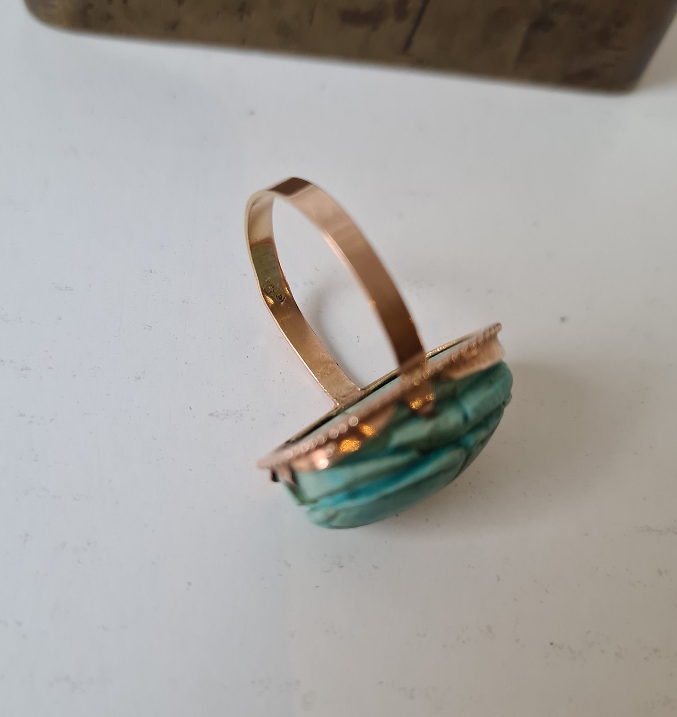 Egyptisk Art Deco guld ring i 12 kt prydet med skarabæ skåret i turkis