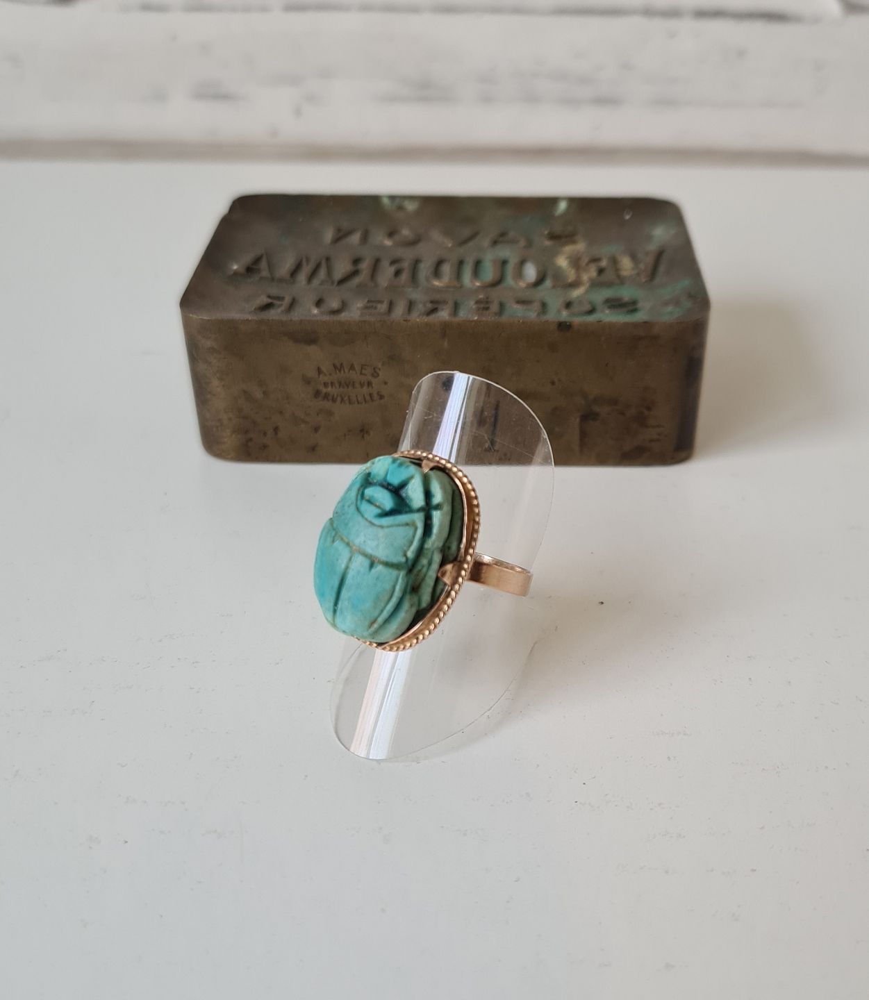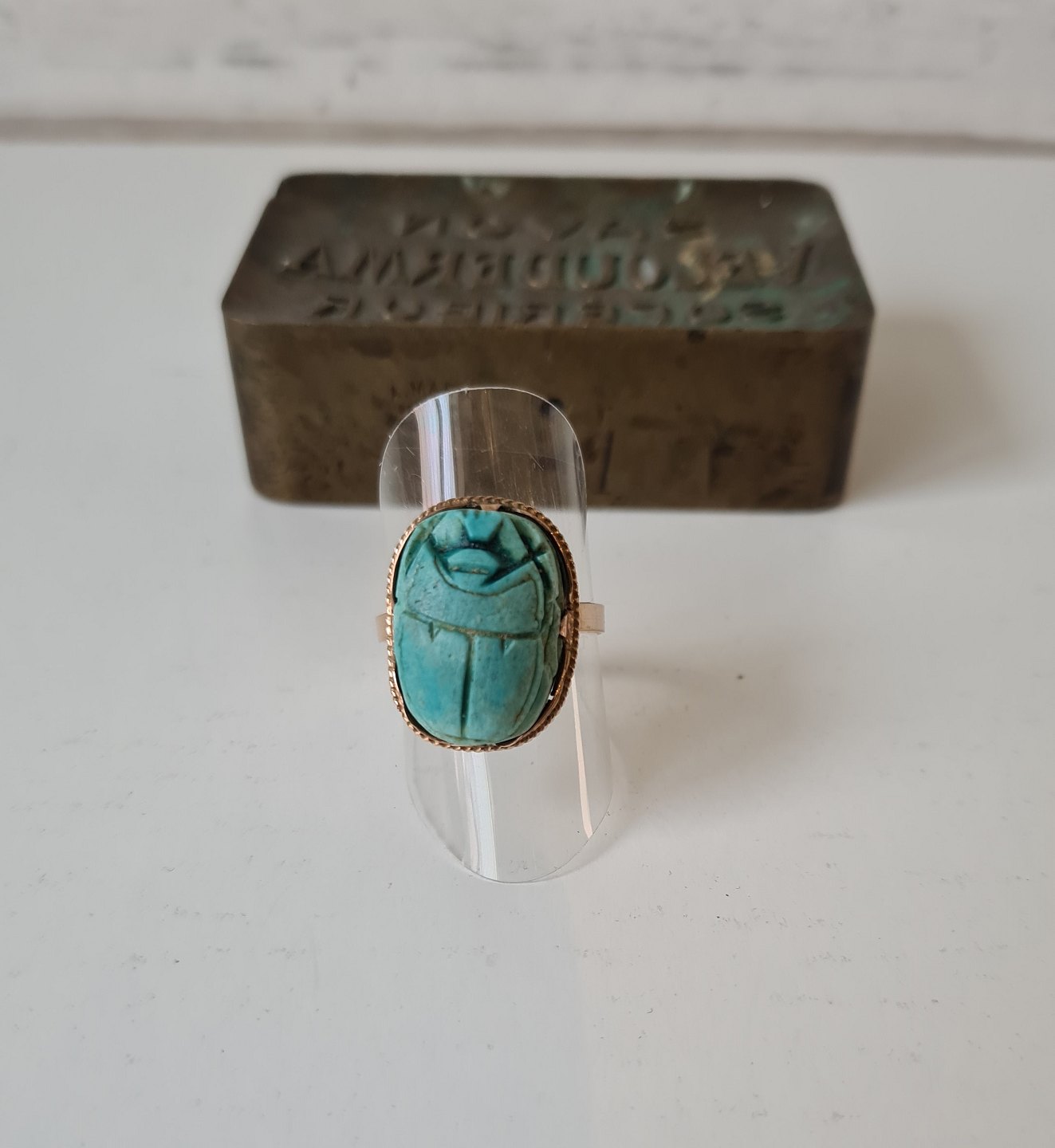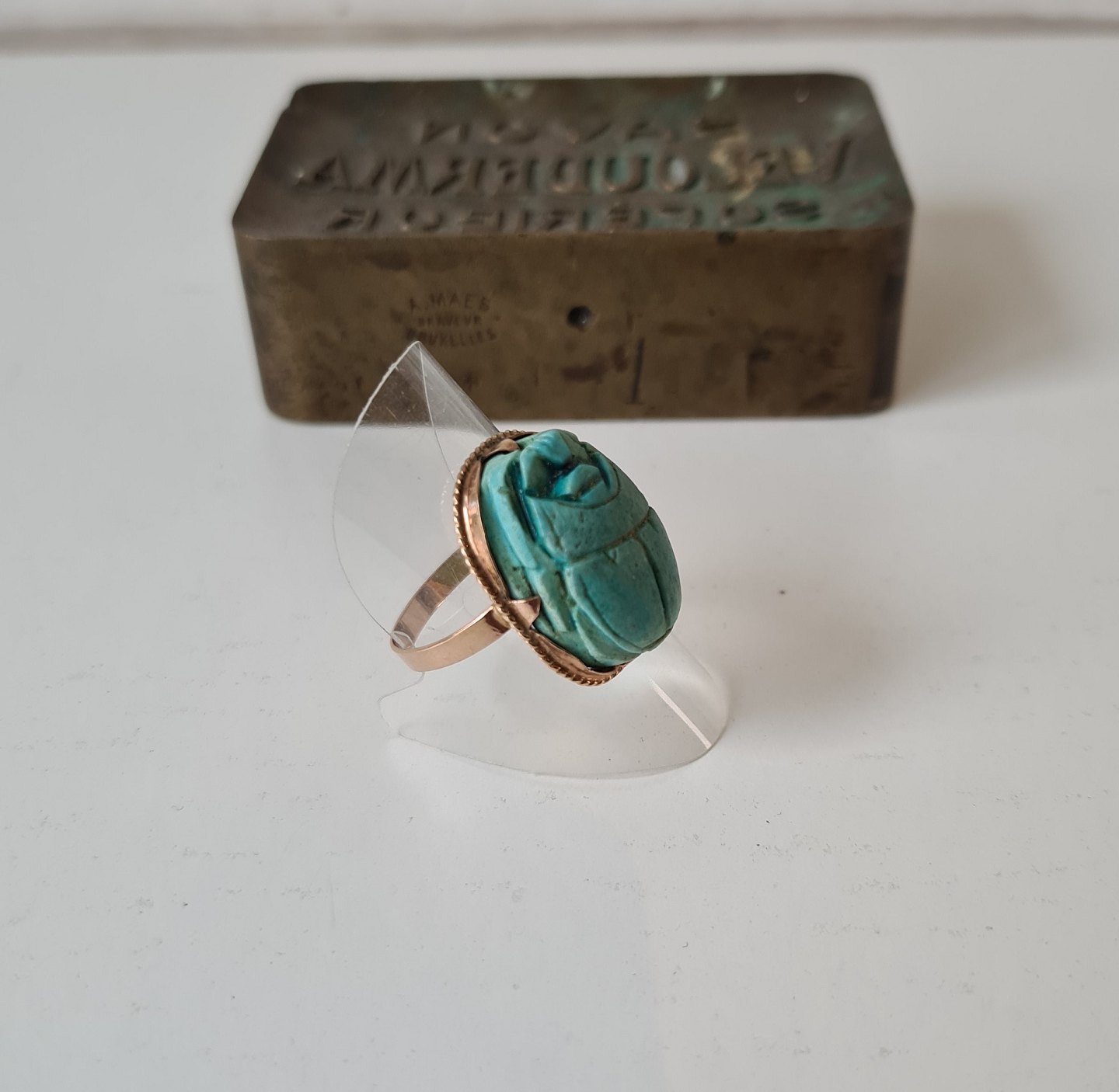 Egyptisk Art Deco guld ring i 12 kt prydet med skarabæ skåret i turkis
