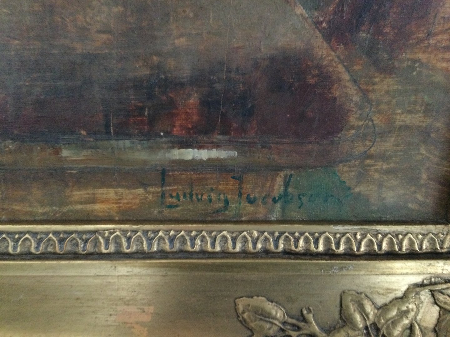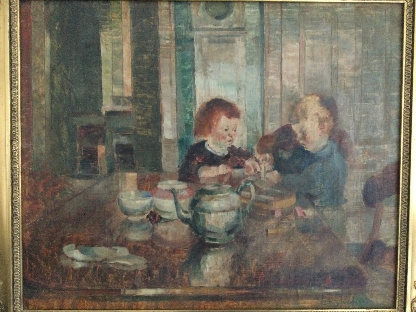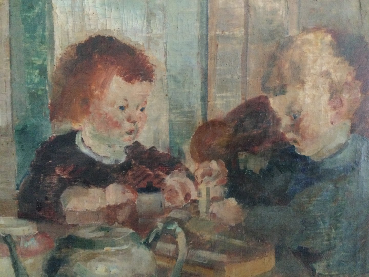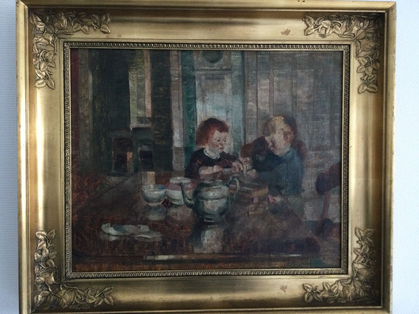 Maleri af Ludvig Jacobsen - Interiør med 2 legende børn ved tebordet.