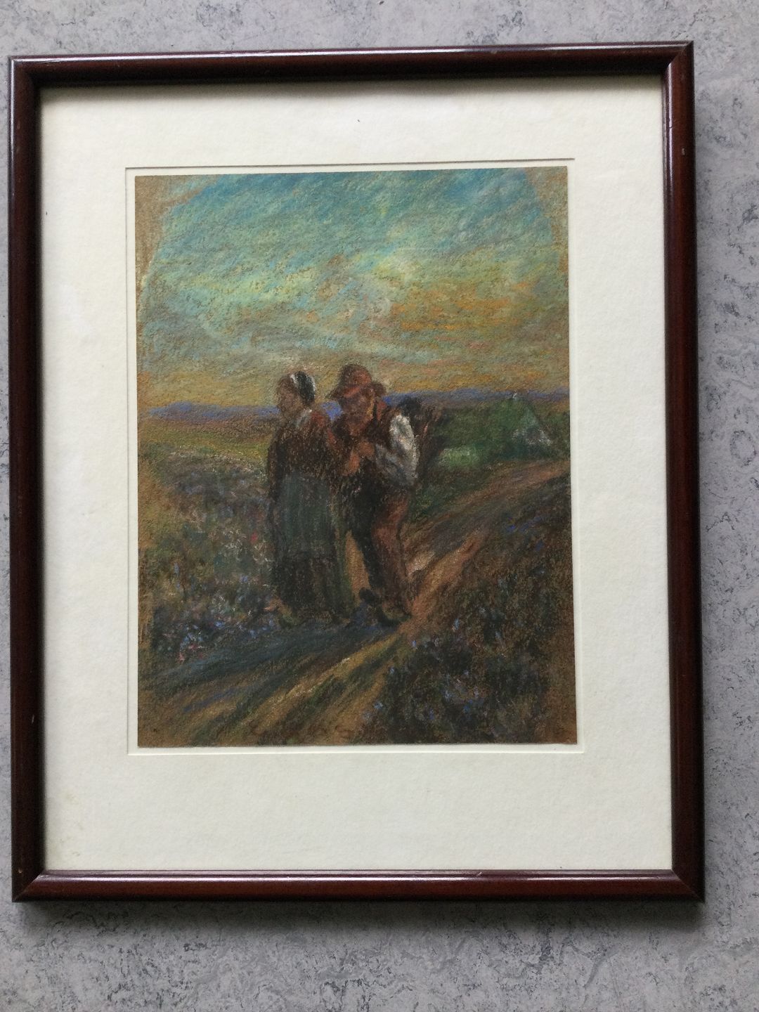 Text available in Danish: Pastel af Erik Sievert - Ældre par på markvej 1917.