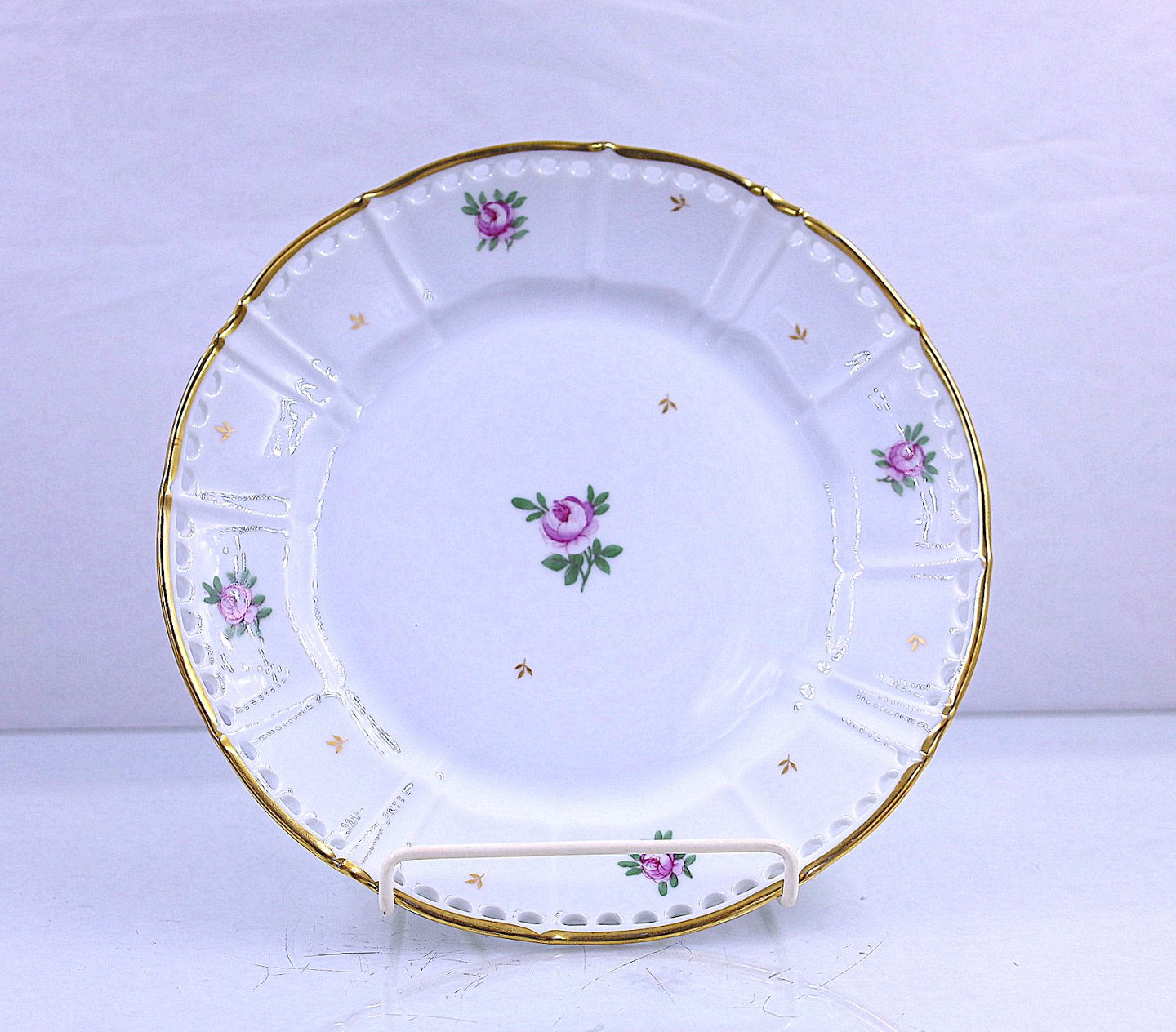 Fadet er i hvidt kantet helblonde porcelæn med bred guldkant og strøblomster