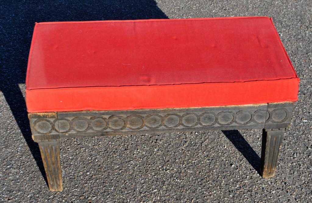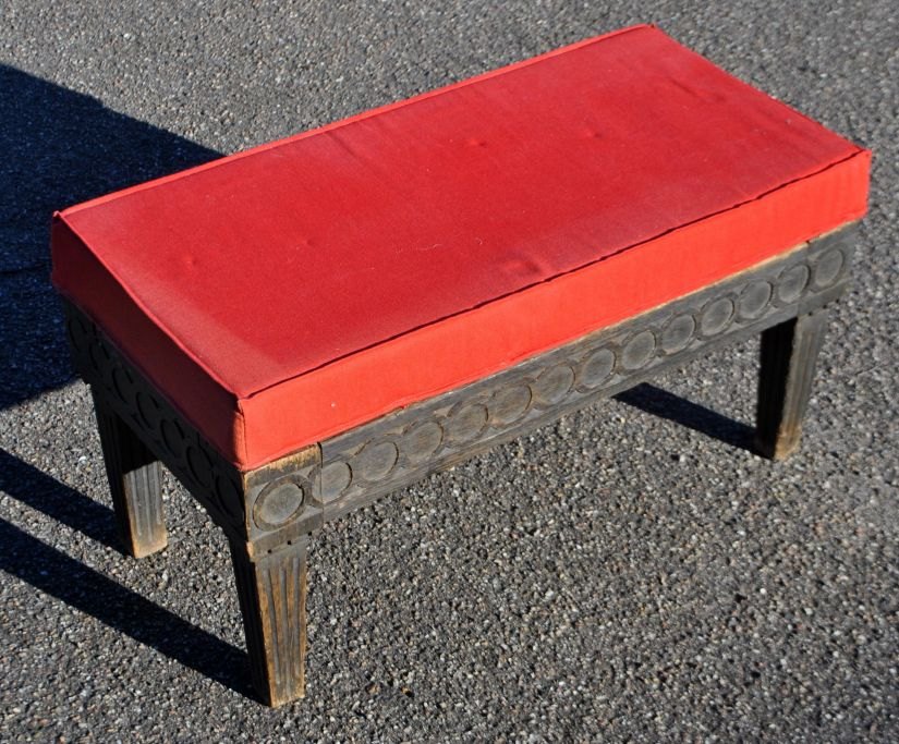 Træunderdel fra en bilægger ovn - omgjort til skammel, Louis XVI - ca. 1700 - 1800, Danmark. Underdel af mørkmalet egevoks poleret egetræ. Med kannellerede ben og dekorationer på sarg. H.: 33 cm. L.: 76 cm. B.: 36,5 cm.