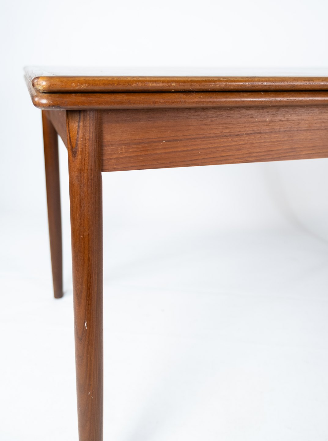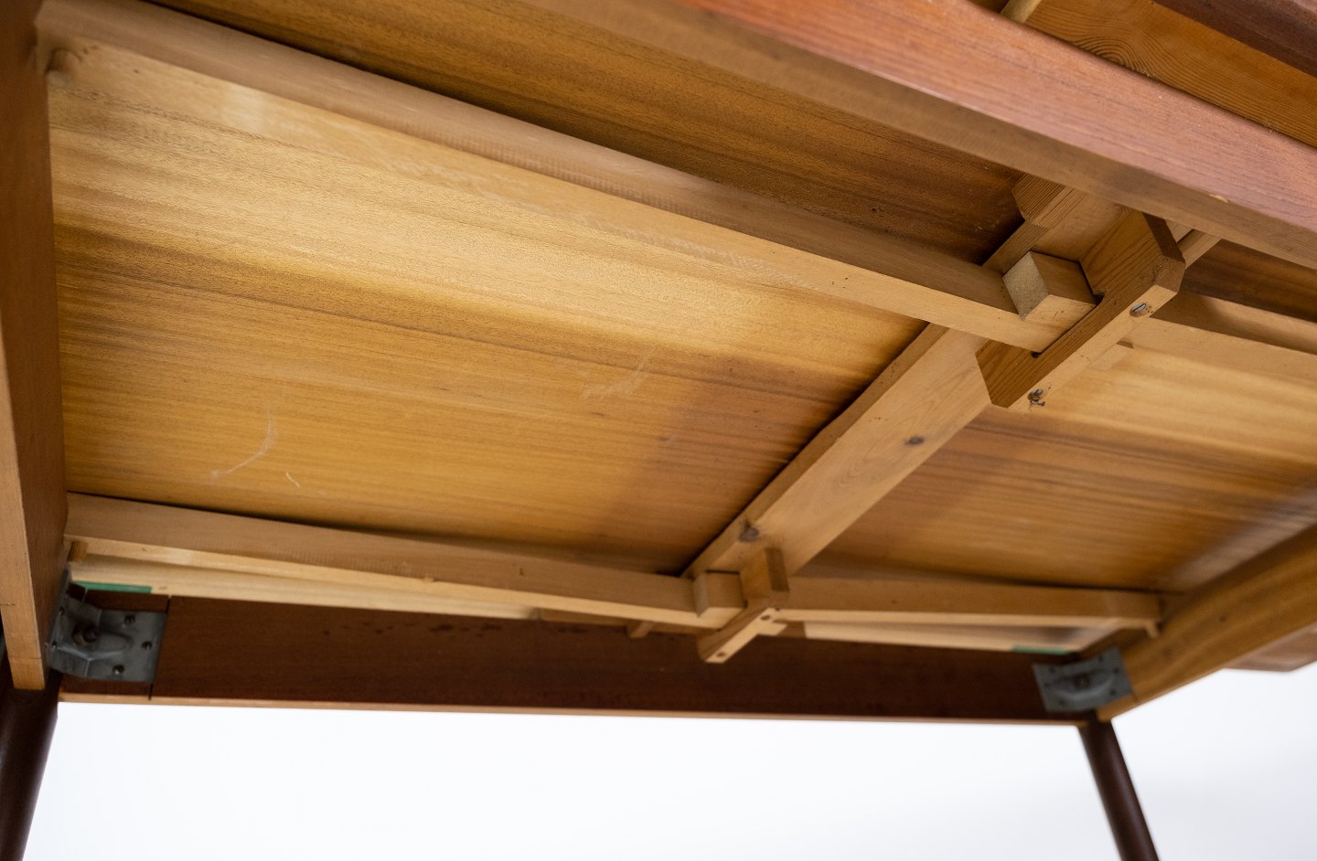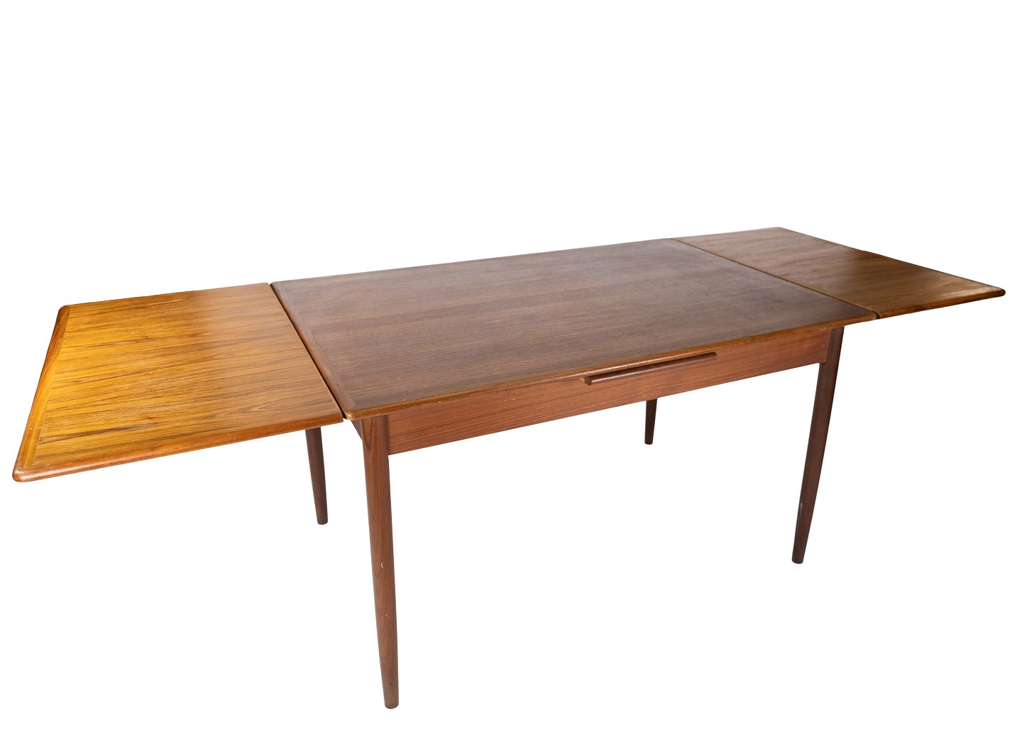 Spisebord i teak med hollandsk udtræk af dansk design fra 1960erne. Bordet er i flot brugt stand.
