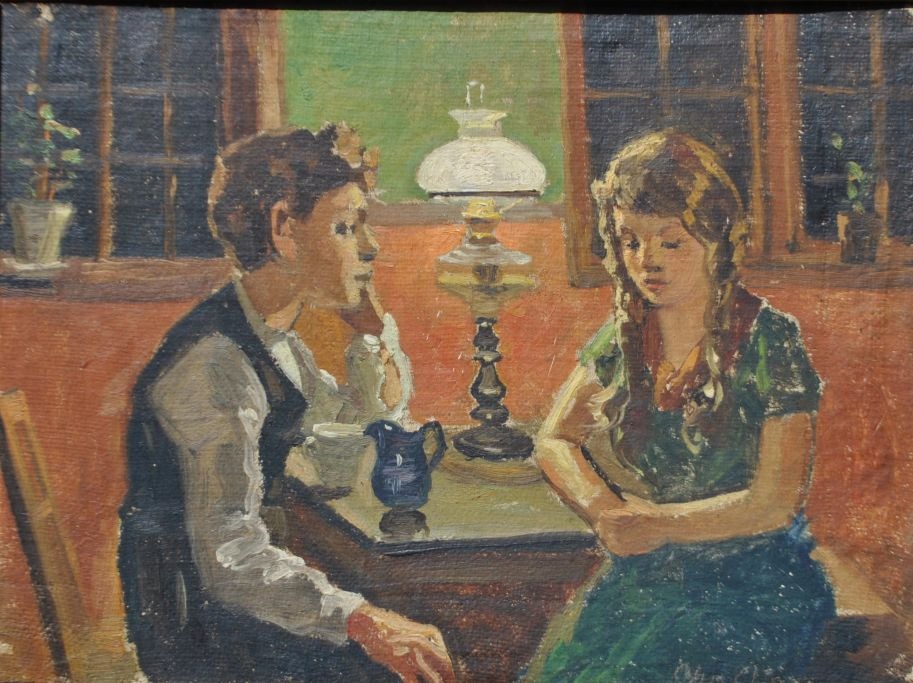 Aigens, Christian (1870 - 1940) Danmark: To børn ved et bord. Olie på lærred/opklæbet på plade. Signeret. 30,5 x 41 cm.