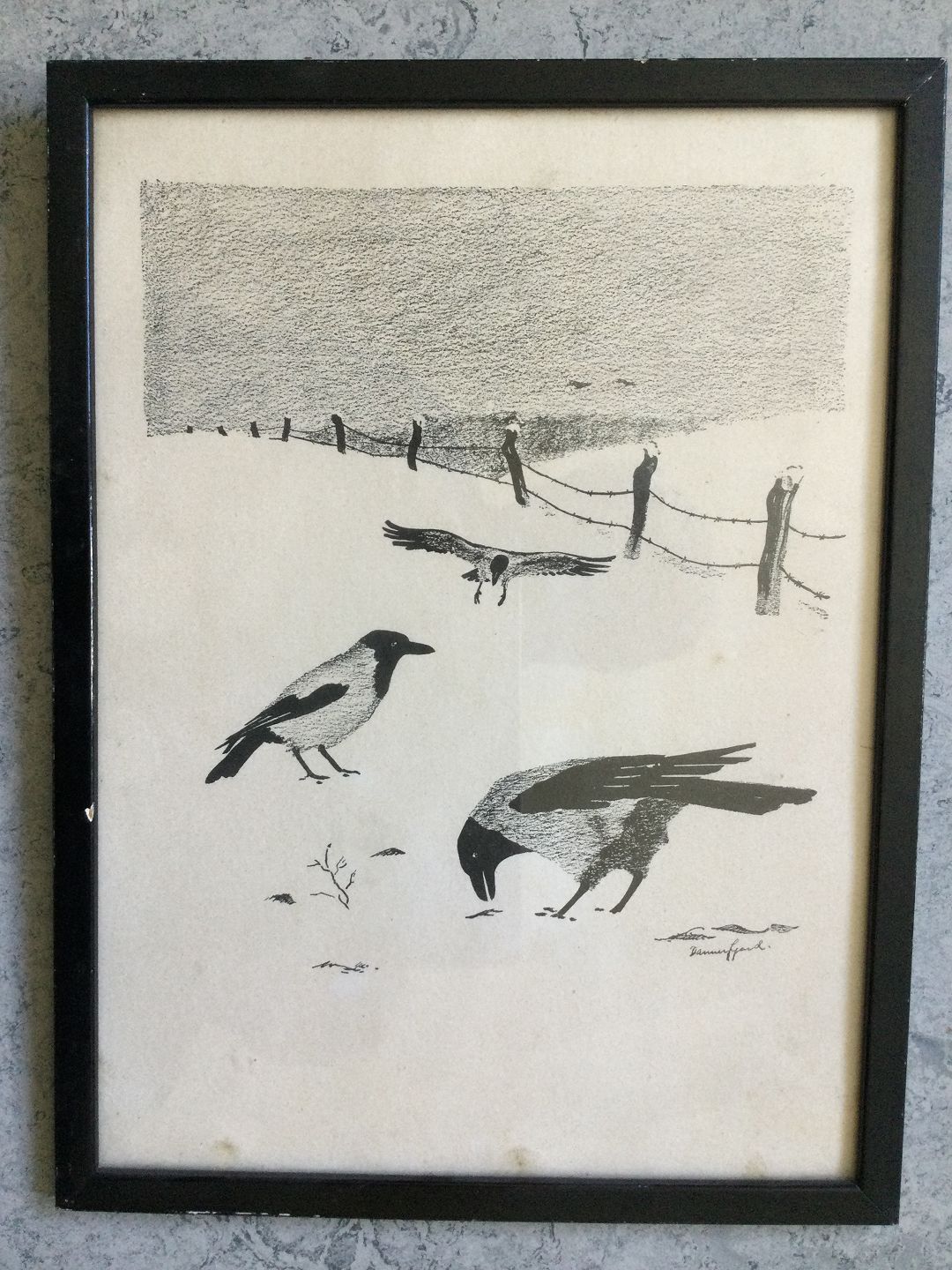 Radering af Willy Dannerfjord - Gråkrager på vintermark.