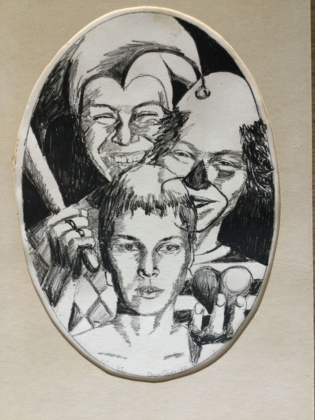 Radering af Anne Torp - Kvinde og 2 klovne 1977.