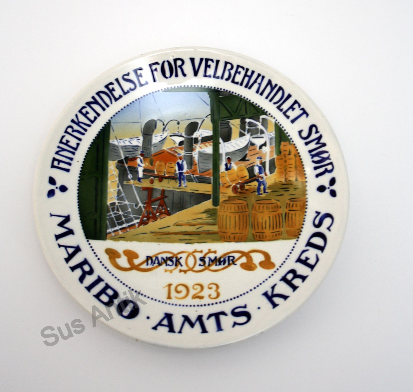 Aluminia, Mejeriplatte, Anerkendelse for velbehandlet smør. Maribo Amts Kreds 1923. Stemplet Kjøbenhavns Fajancefabrik Danmark. Luftmalet dekoration efter tegning af Oscar Willerup.