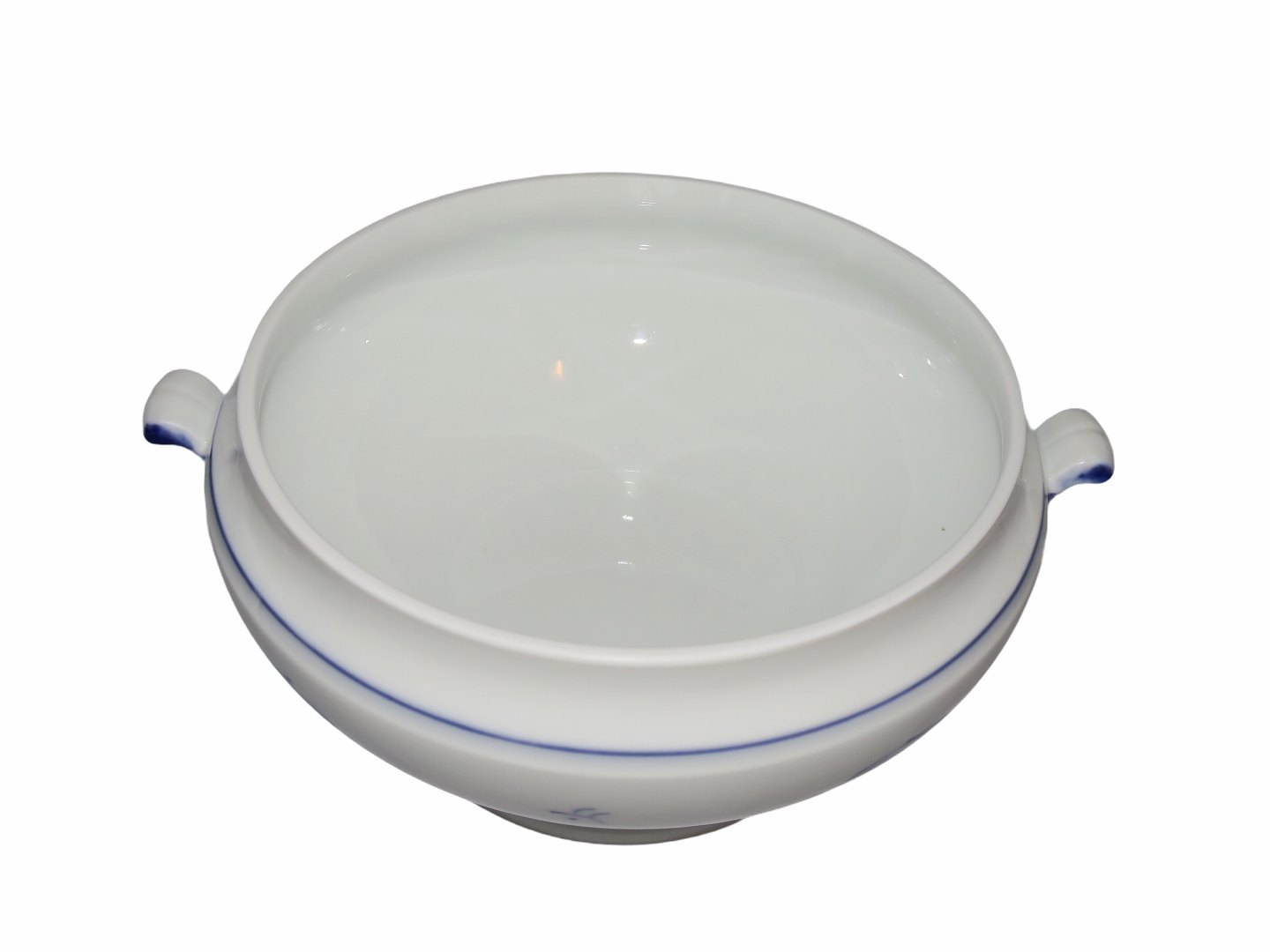 Bing & Grøndahl Jubilæumsstellet dekoreret med blå nelliker, skål der mangler et låg.