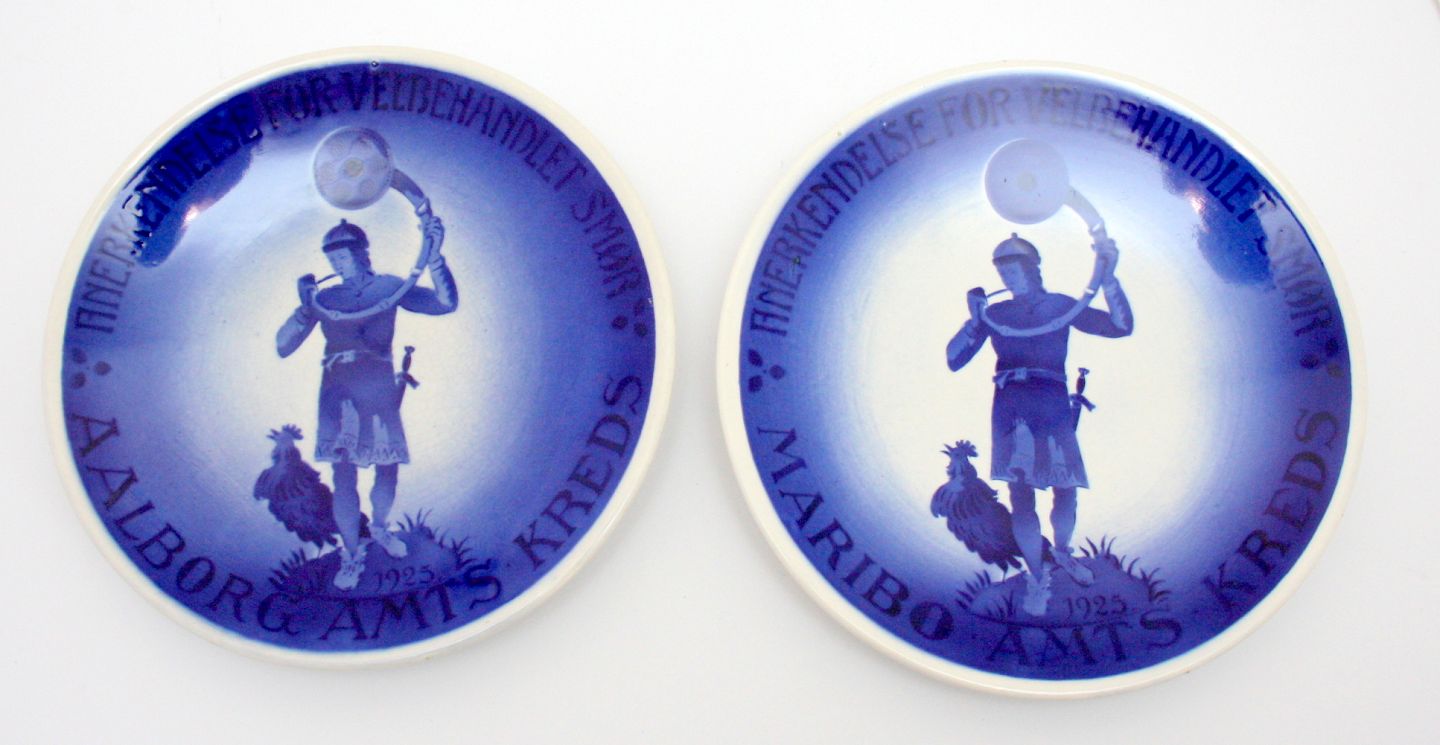 Aluminia, Mejeriplatte, Anerkendelse for velbehandlet smør. Motiv med lurblæser. Stemplet Kjøbenhavns Fajancefabrik Danmark. Luftmalet dekoration efter tegning af Oscar Willerup.